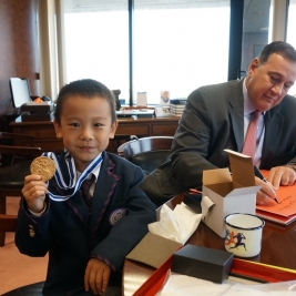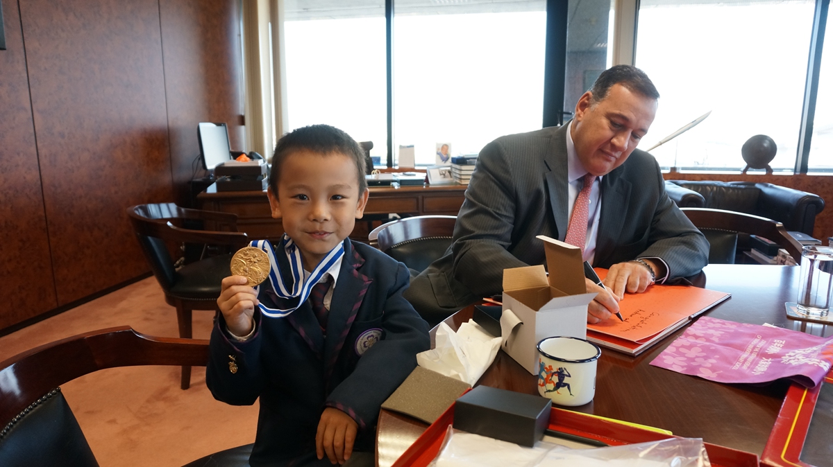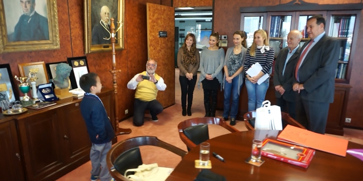 鐾诚早早起床,和爸爸一起赶到雅典奥委会拜访雅典奥委会主席SPYROS I. CAPRALOS先生。祝贺2004雅典奥运会成功举办10周年,并征集奥委会对百年附小的祝福。08年出生的“奥运宝宝”鐾诚与主席互换礼物,鐾诚的礼物是亲手拼插的天坛模型和附小百年校庆小旗(这个鐾诚还真有点舍不得)