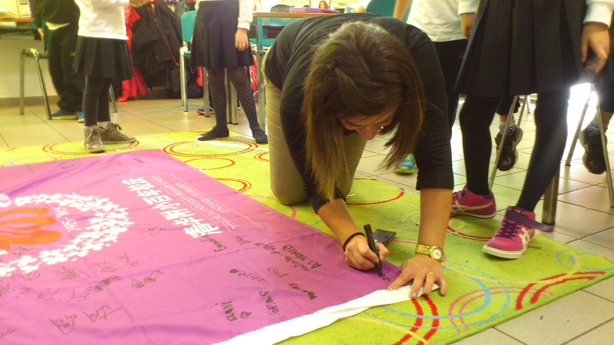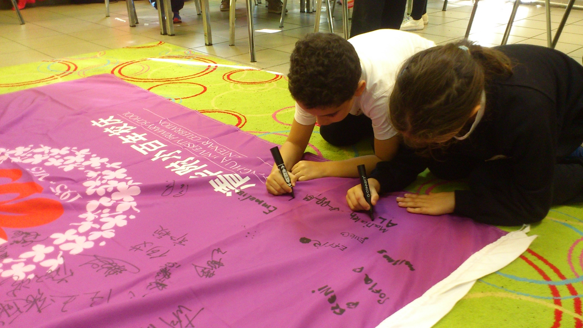 全班十几个小同学得知鐾诚和爸爸从遥远的中国北京来到雅典,小孩子们齐声的“哇喔”了一声。因为只有两根签字笔,小同学们轮流上前签名。