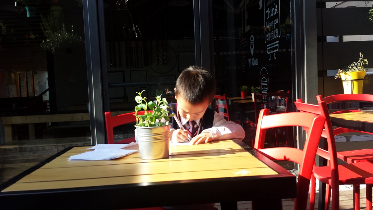每天早餐后,鐾诚也不忘先完成假期的作业。