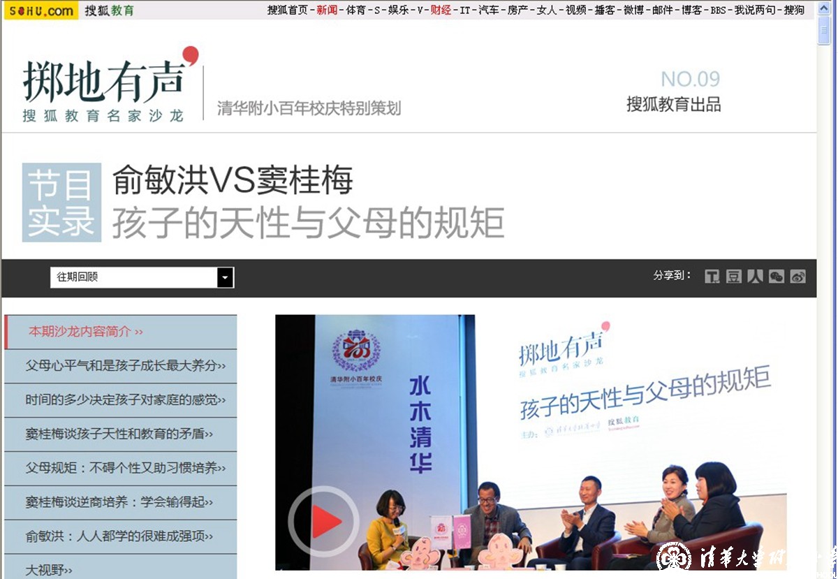 11月14日,《掷地有声》名家沙龙栏目再次走进清华附小,邀请到了新东方教育科技集团董事长兼CEO俞敏洪对话清华附小小学校长窦桂梅谈孩子的天性与家庭的规矩。2015年10月17日,清华附小将迎来100年校庆。在校庆开启之际搜狐教育联合清华附小邀请到了俞敏洪和窦桂梅一起给师生和家长们分享一场家庭教育的沙龙盛宴。