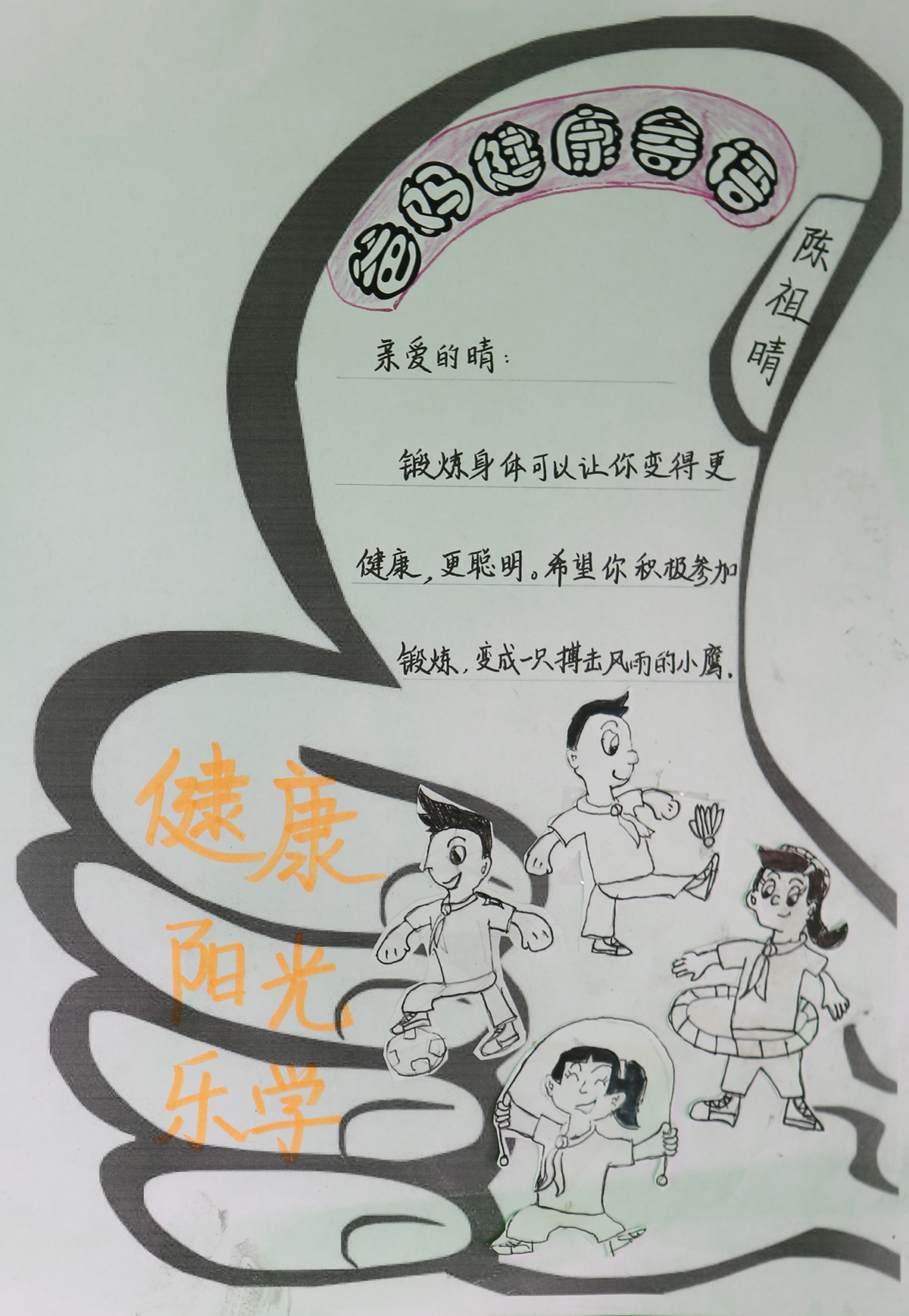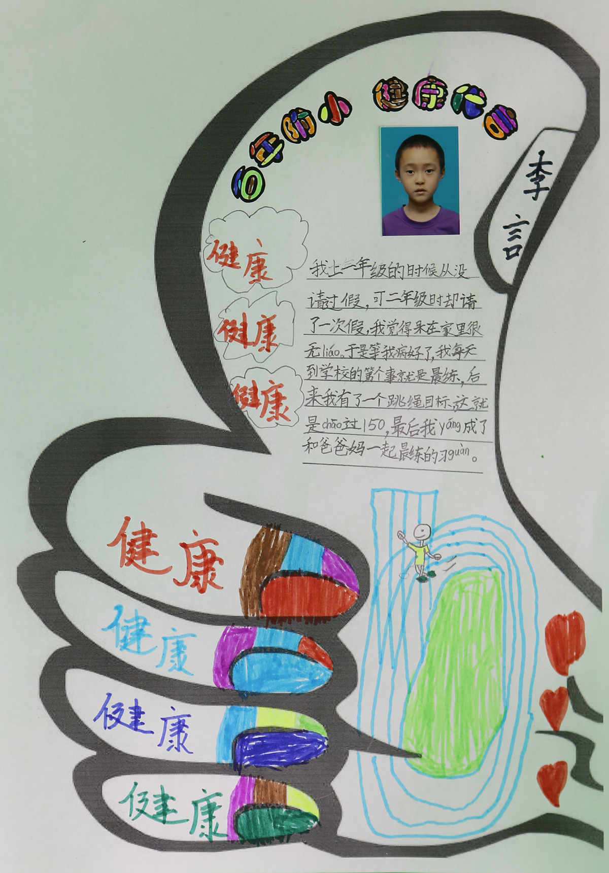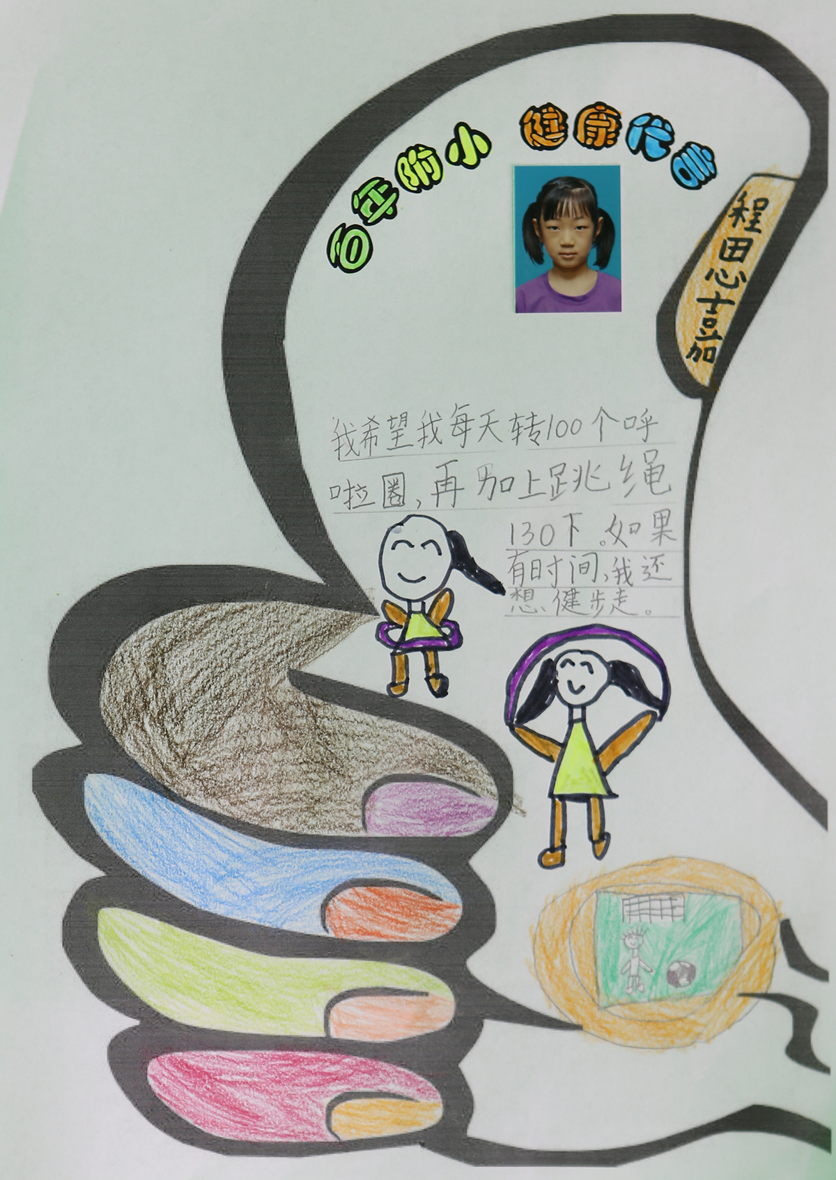 李炫慷爸妈的健康寄语 现在每一天的晨练微课堂中,二(2)班都有30多名同学积极参加。随着同学们的积极性越来越高,李老师听取了班里同学们的建议。班级开展了“我是附小健康代言人”的活动。谢雨琪第一个跟她报名——老师我可喜欢转呼啦圈了,而且我还可以教同学们一起转呼啦圈。好啊!听了雨琪的想法,李老师立刻建议她组织了一个小小的呼啦圈社团。在雨琪小老师的带领下,班里由只有一人会转到现在二十多人都会转呼啦圈了!就是这样,跑步、健步走、跳绳、踢毽子、羽毛球、跳皮筋、编花篮……这些运动同学们自己都玩起来了。相信到了百年校庆的时候,二(2)班的同学会更加健康,更加快乐,他们正在为健康储蓄。李老师相信同学们:今天,将追求健康当成一生的信念;明日,将以强健的体魄来迎接附小的百年校庆。愿附小的每一位同学都热爱体育运动,都能茁壮成长!