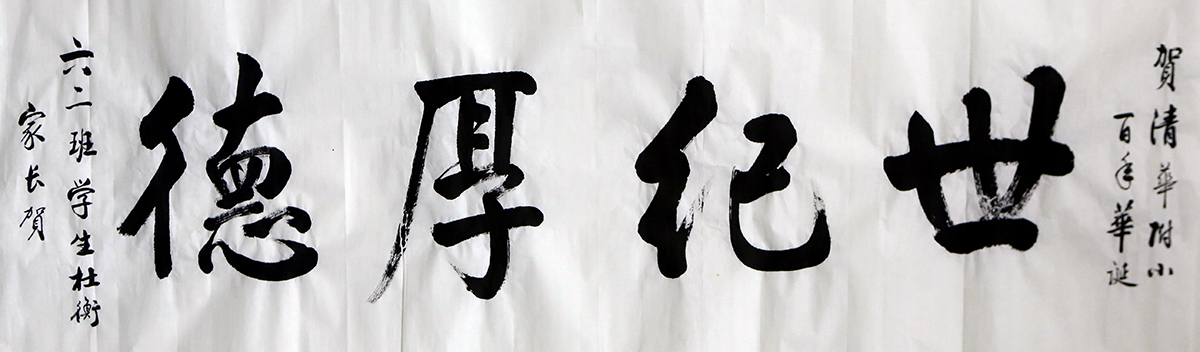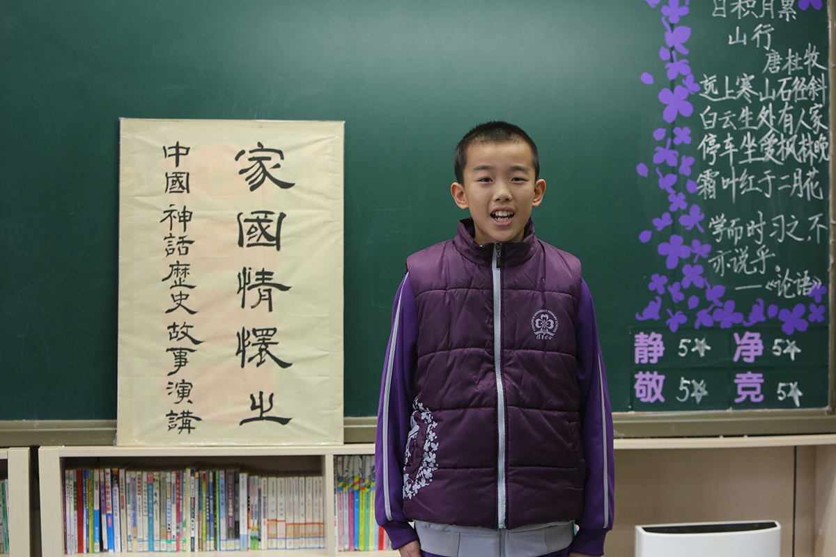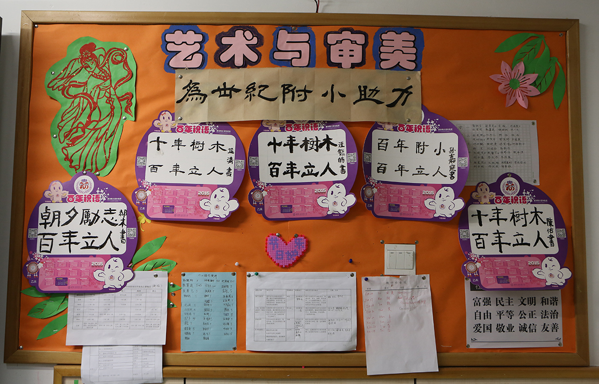 六(2)班的“微笑、感谢、赞美星” 好的课程一定是持久的、呈序列化的,应云老师长期坚持培养学生的传统文化意识,念诗吹箫,对联吟诵,让学生为附小百年讲一百个历史故事,努力培养学生中国灵魂,完整人格,对联的意义不仅仅是展示才华,背后的意义是人格的完整,一左一右,一呼一应,对称均衡,对联里面有很多关于如何做人的故事。应老师说要趁着学生年少的时候,记忆最好的时候来背诵中国老祖宗这些美好的诗词对联,正如应老师所说,他还在开发课程,准备以附小植物为文化意象,通过诗词来解读百年的附小,同时六(2)班的家长也提笔为附小百年题词,让人无不动容。
