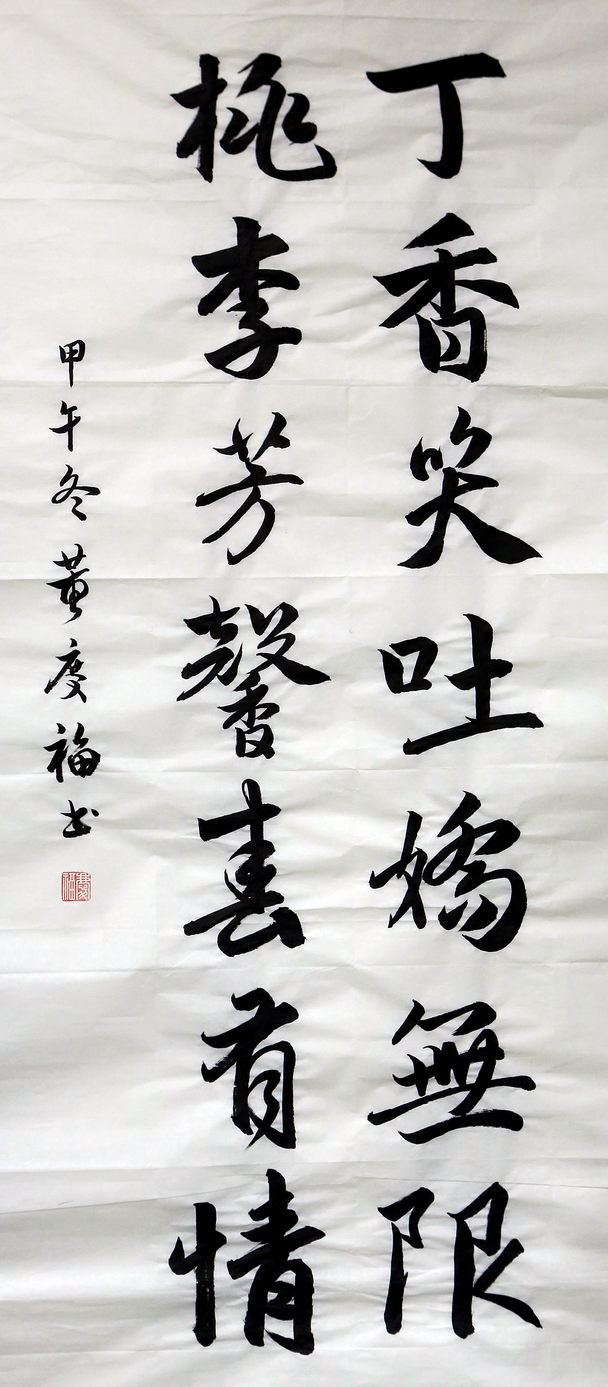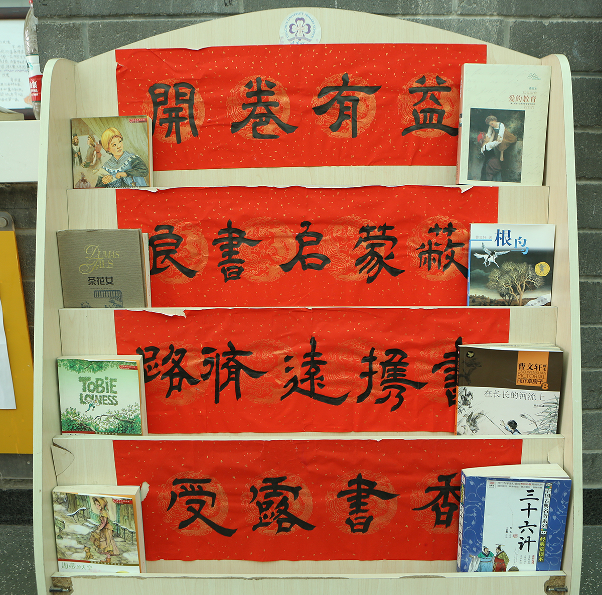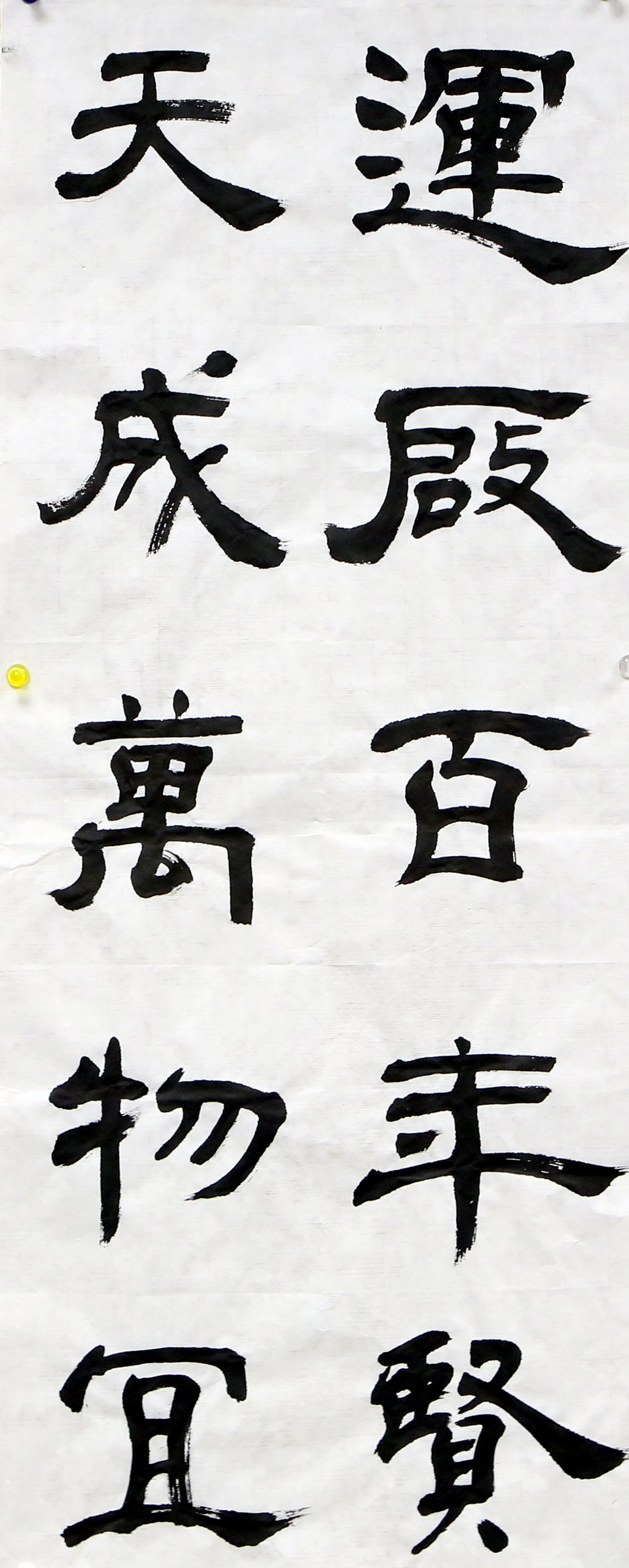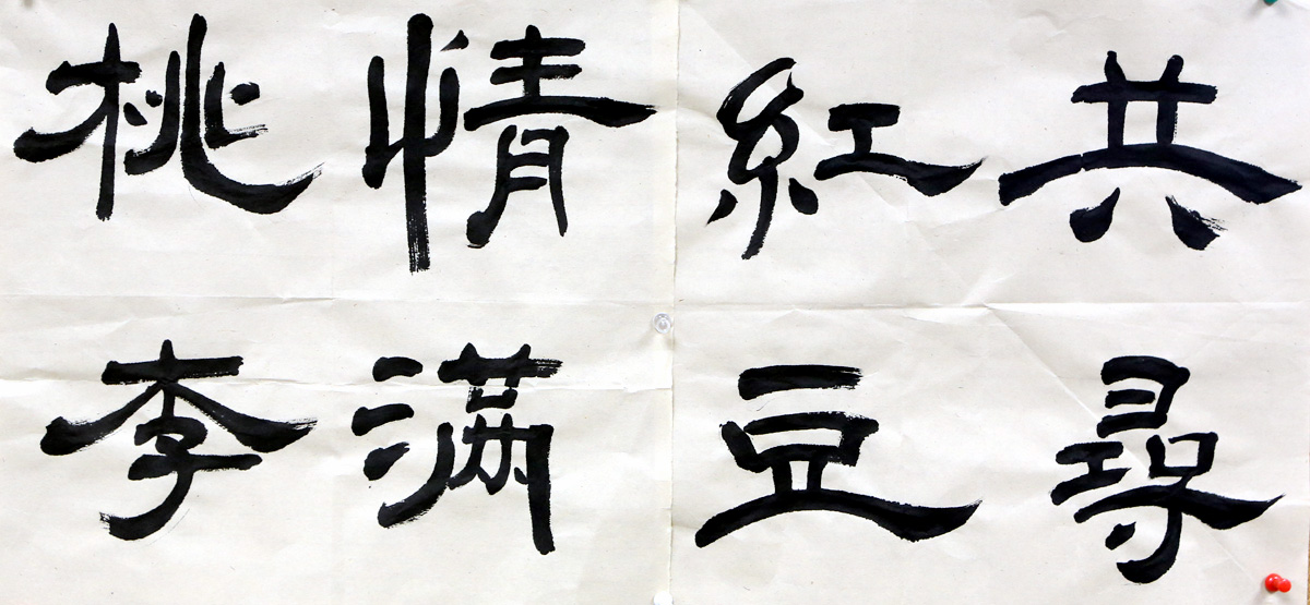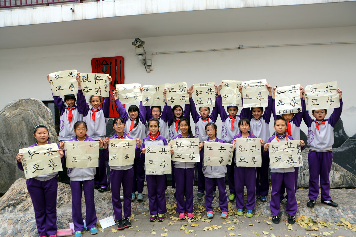 通过一系列的教学实验,学生的书法水平得到了长足进步,应老师又开始借着校庆的机会,给班级打造个性课程——为附小百年书写对联,利用校花丁香花等文化元素,以隶书的方式来书写对联,如“共寻红豆、情满桃李”,红豆为相思之物,思念母校思念恩师;“运启百年贤,天成万物宜”,表达了对母校的情感;“华韵袅袅余音绕梁,丁香点点微红才吐”,倾诉了母校对儿女们的殷切希望。
