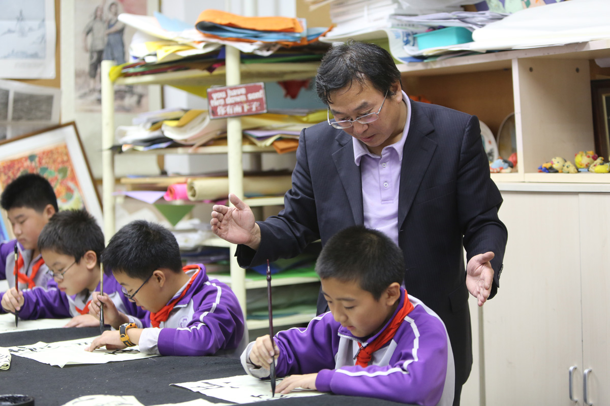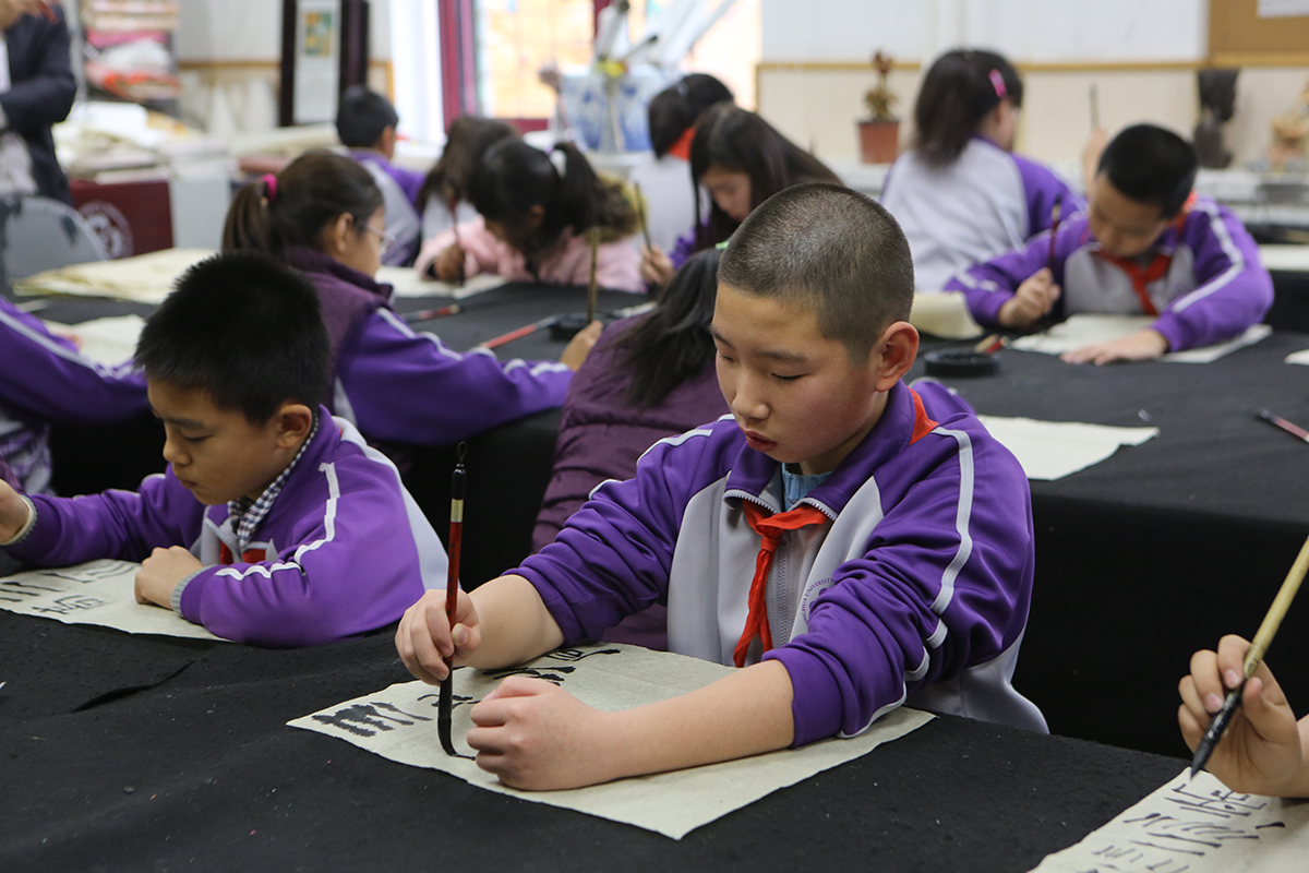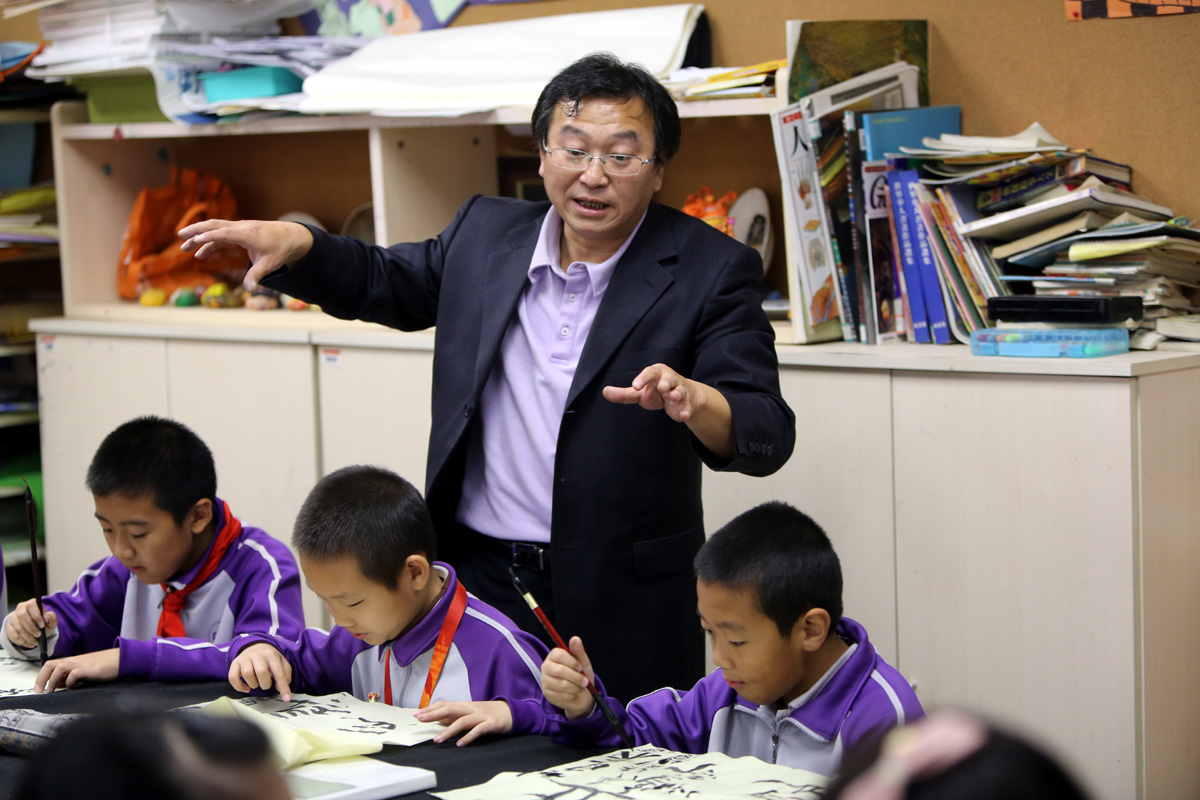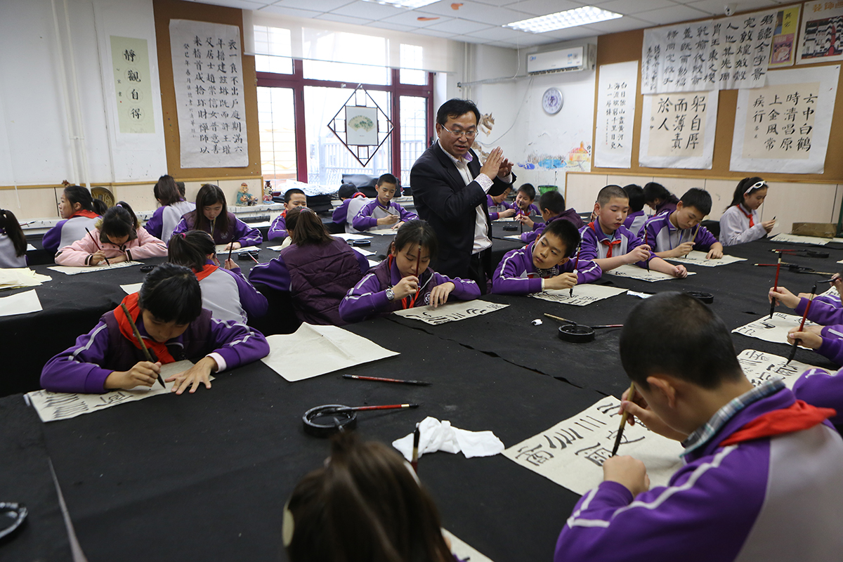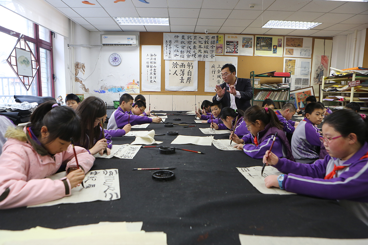 六(2)班学生认真练习书法 这就是清华附小六年级2班,班集体的文化环境建设是以书法为主题的,班里的同学们都喜欢上书法课,同学们说书法课是比较轻松自由的,而授课的应老师却说书法是控制后的性格体现。应老师作为班主任,又酷爱书法,他希望培养学生终身的好兴趣,激发学生对中国传统艺术书法的热爱。