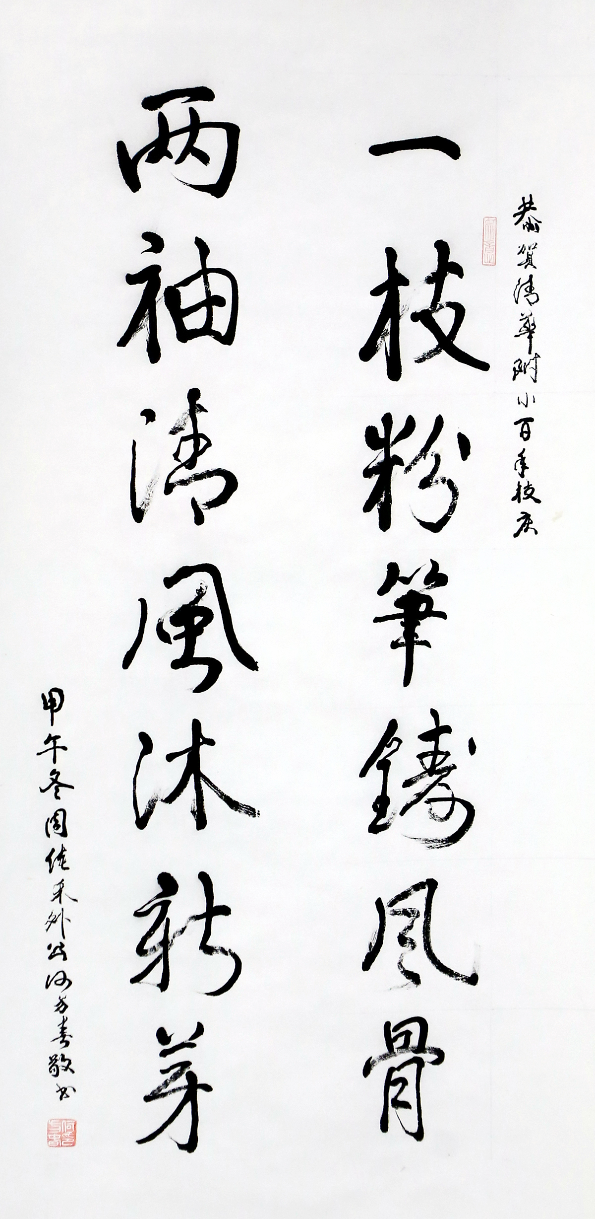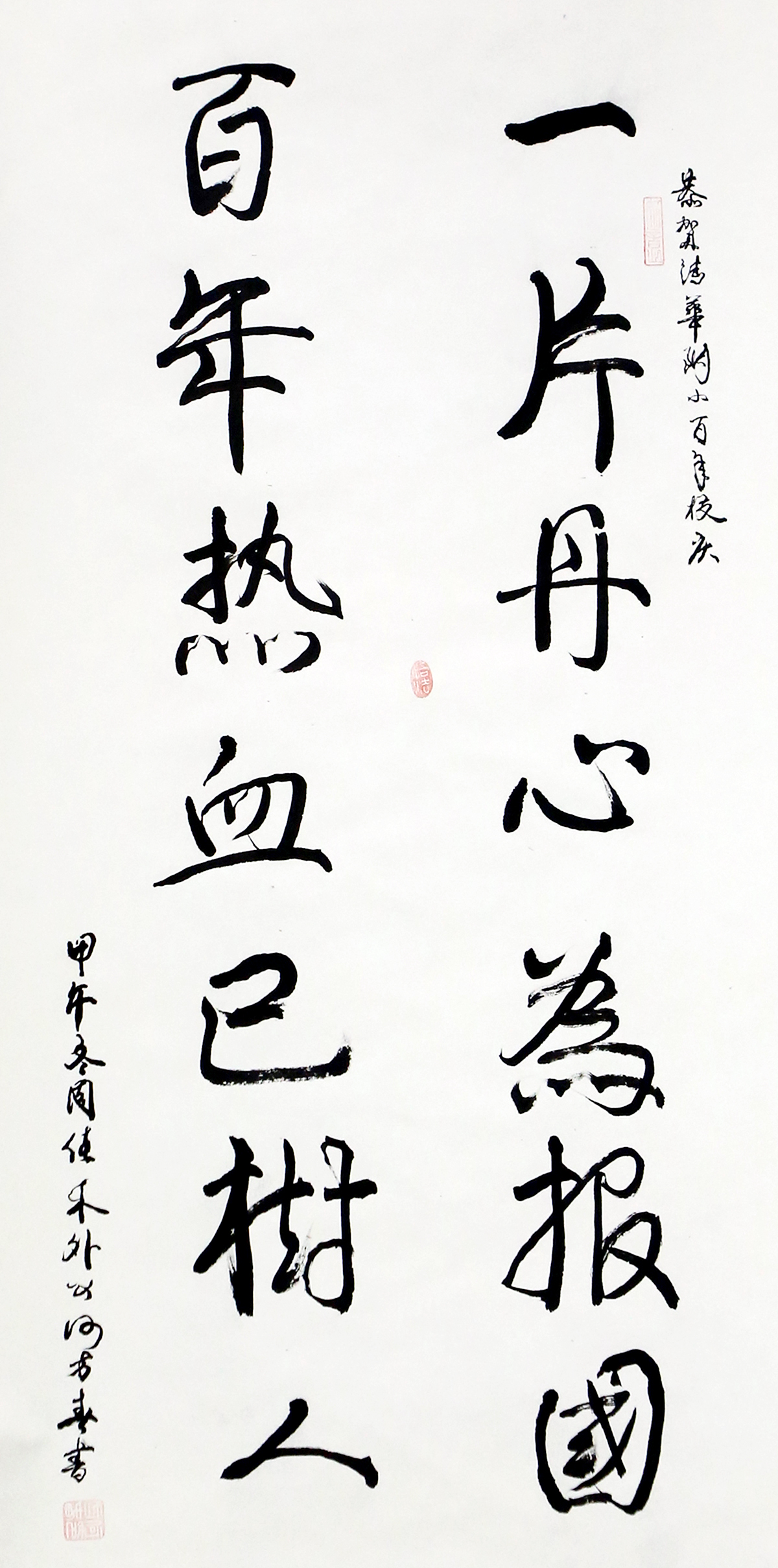 六(2)班全体同学将用百幅书法作品为附小百年献礼 书法课堂上,应云老师正在鼓励一位对书写对联失去信心的同学:“同学,你不要着急,你书法的线条很有劲道,很有些清朝书法家金农的气势,到了百年校庆的时候你一定会比现在写的更好,用好的作品来为母校喝彩!”同学们听了都会心一笑。