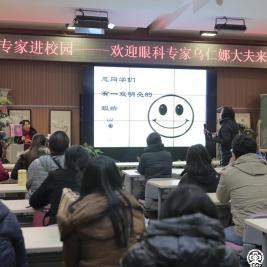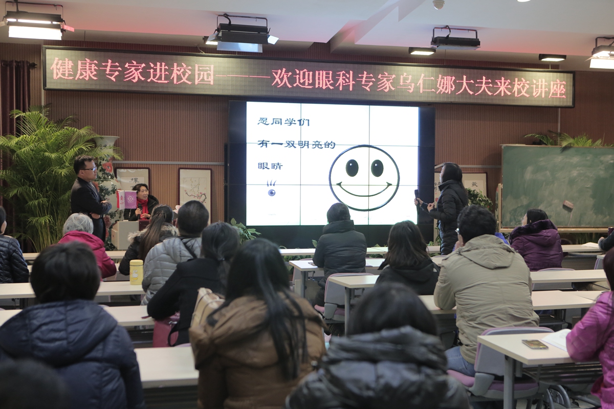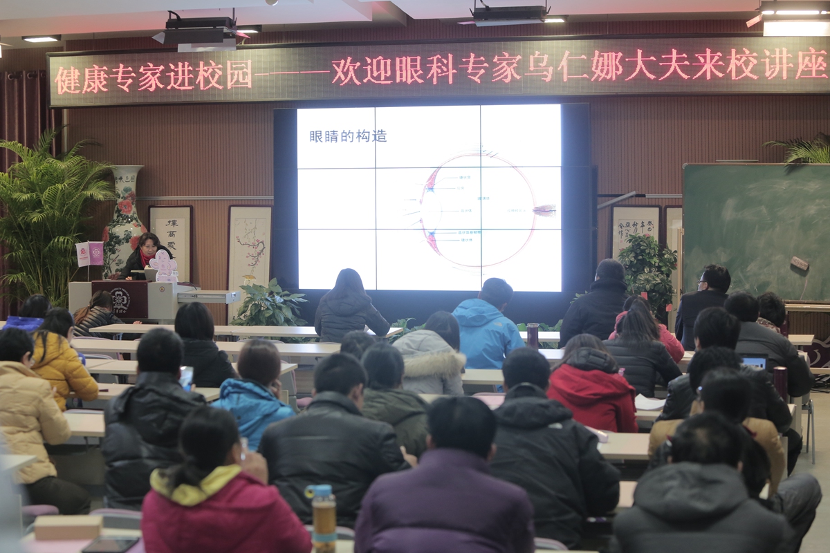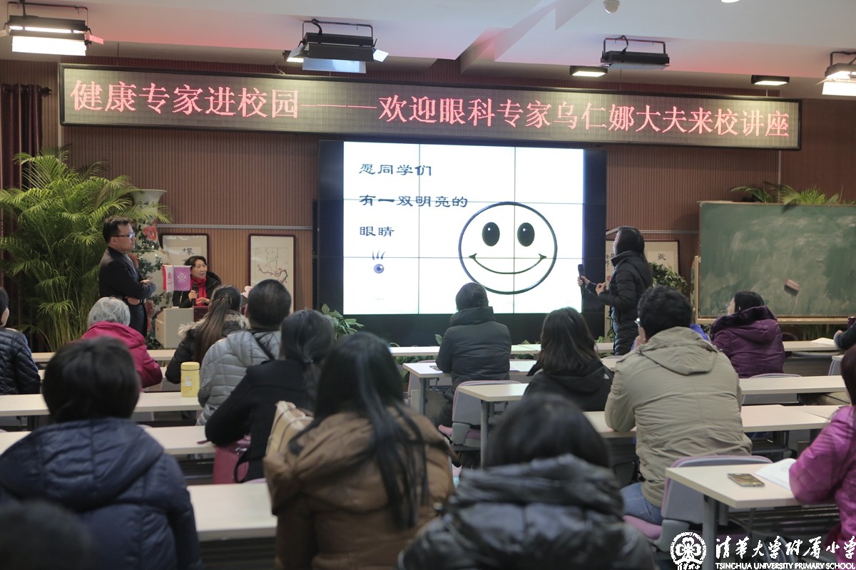 2014年12月5日下午,清华附小举办健康专家进校园活动,特别邀请清华大学校医院眼科专家乌仁娜大夫来校,针对学生视力不良的问题为教师及学生监护人做了以“爱护眼睛 预防近视”为主题的健康知识讲座,学校老师和部分家长代表参加了本次活动。