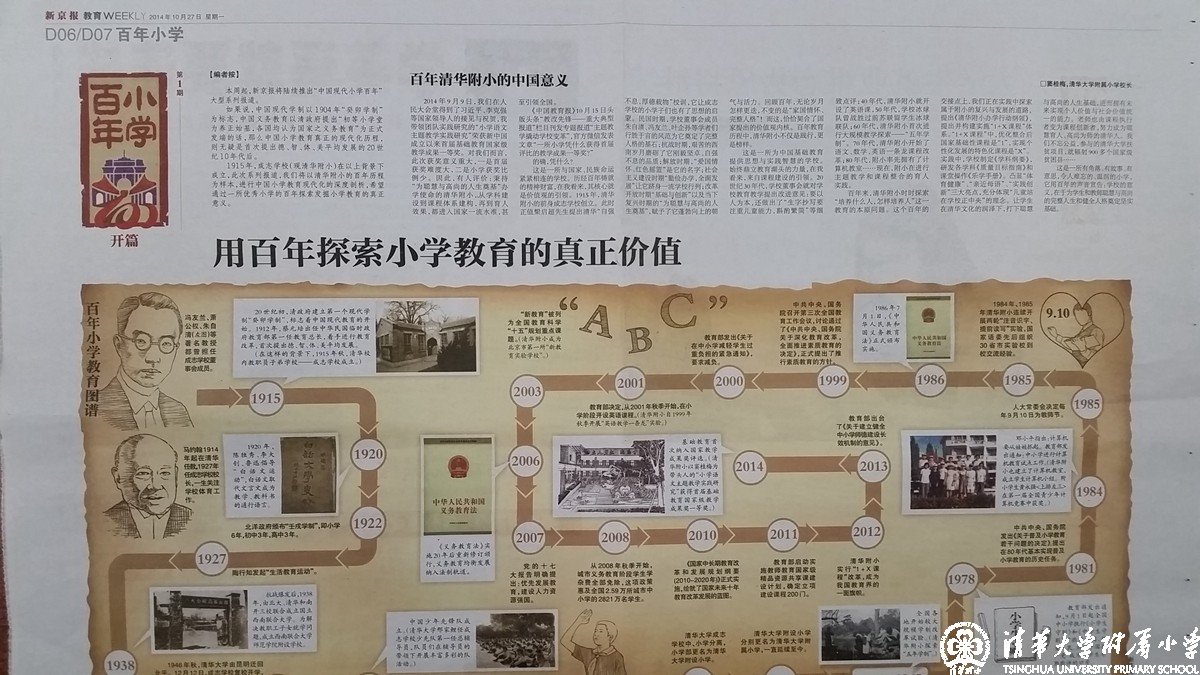 这是一所为中国基础教育提供思想与实践智慧的学校。始终鼎立教育潮头的力量,在我看来,来自课程建设的引领。20世纪30年代,学校董事会就对学校教育教学提出改进意见:要以人为本,还做出了“生字抄写要注重儿童能力,斟酌繁简”等细致点评;40年代,清华附小就开设了英语课,50年代,学校冰球队曾战胜过前苏联留学生冰球联队;60年代,清华附小首次进行大规模教学探索——“五年学制”。70年代,清华附小开始了语文、数学、英语一条龙课程改革;80年代,附小率先拥有了计算机教室……现在,附小在进行主题教学和课程整合的育人实践。