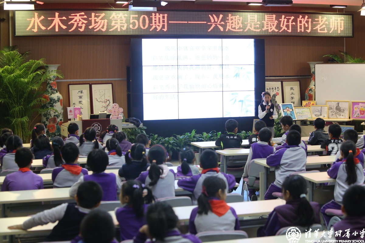 随着作品在学校艺术节中展出后,班主任韩老师主动找到我们,希望孩子能在水木秀场上秀出更加精彩的自己。我们非常兴奋和感激给了孩子更大的舞台和机会展示自己。在韩老师、贺老师的悉心指导下,在学校老师的积极配合下,第50期水木秀场——兴趣是最好的老师如约而至。看着孩子自信地表演,看着台下小观众们期待的目光,我们深深地感受到了学校“让孩子站在学校的正中央”精髓的教育理念。