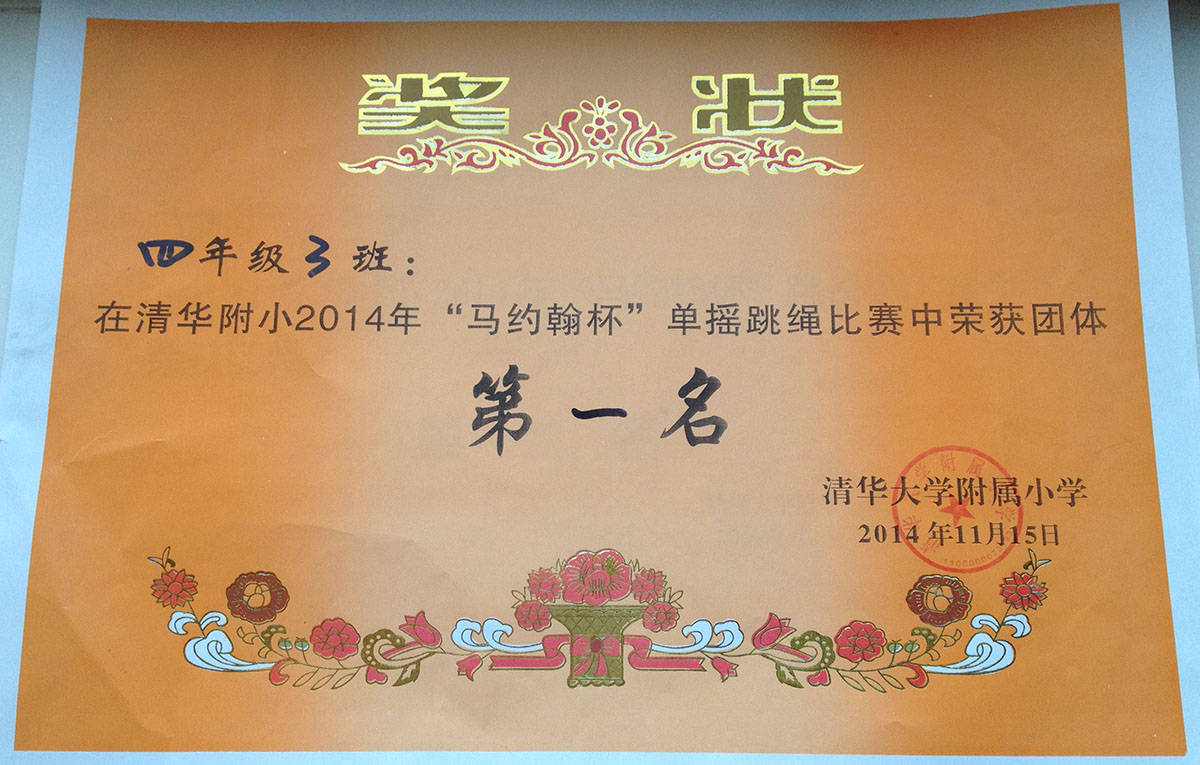 清华人爱体育,有传承;附小人我运动,我快乐!体育课锻造了附小人独特的精神气质,跳绳增强了四(3)班的班级凝聚力及荣誉感,真是活动育人呀!连续夺冠极大地鼓舞了同学们的士气,大家纷纷表示:要继续挑战自我,让小小的跳绳变出无穷的新花样,以变化无穷、乐趣无限的花样跳绳为百年附小献礼,大家拭目以待吧!