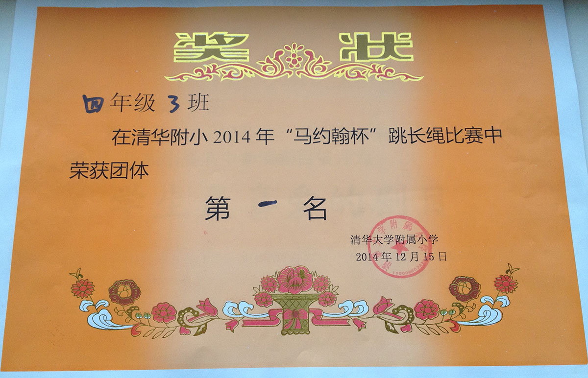 跳长绳比赛团体第一名奖状 在学校的颁奖礼上,四(3)班连连获奖。每天的健身大课间,四(3)班同学那轻盈的身姿,迅速而又齐整的跳跃都能吸引很多的观众!获奖的同学们欢呼、雀跃,金色的奖状在一双双明亮的眼睛里闪动着,大家为自己的努力而感到自豪!