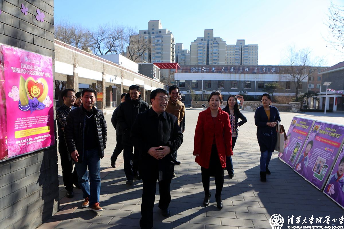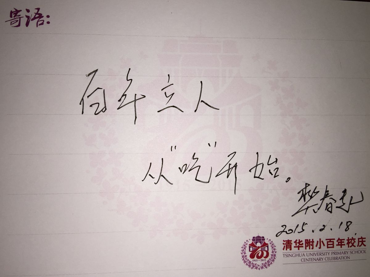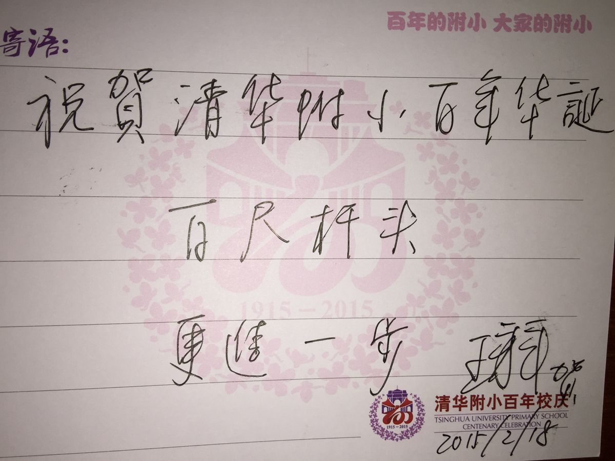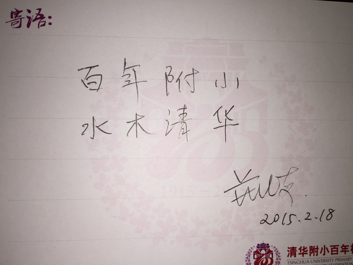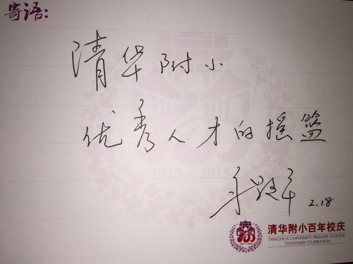 程校长一行四人非常关心附小老师住房和学生午餐,肯定并感谢附小对学生加餐、午餐所做的努力,表示大学会加大支持附小力度,努力解决教师周转住房、学生中午就餐的后顾之忧。谈到2015年是附小百年华诞,四位领导表示大学支持附小举行隆重而简朴的百年校庆,并欣然写下对百年附小的祝福,其中程校长写道:清华附小,优秀人才的摇篮!