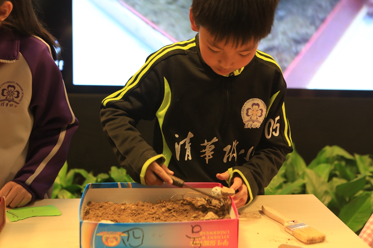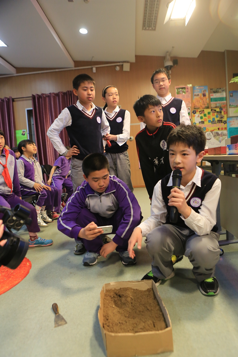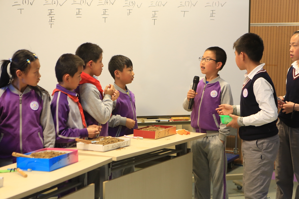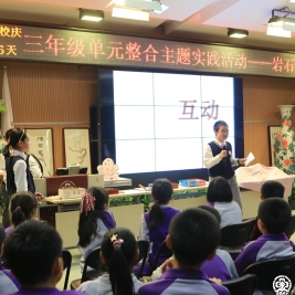 这次活动也是学生自己开发的毕业课程,五年级岩石社团成立以后,孩子们一直致力于岩石知识的研究。在团长阳抒诚的带领下,结合三年级岩石单元,他们从自己制定课程目标,方案,进行明确的任务分工,到岩石、沙土的准备与搬运,奖品的设置、挑选与购买,再到他们牺牲自己的周末进行反复的试讲,最终给同学们带来了一场精彩的岩石讲座!