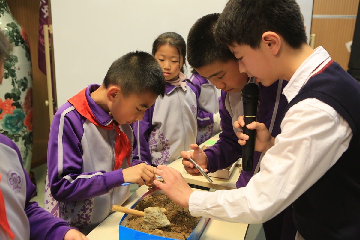 昨天,六(3)的岩石社团的阳抒诚、刘荣昊、马靖宸、张宇洋、朱伊为三年级的小学弟们学妹们进行了一场别开生面的岩石讲座。