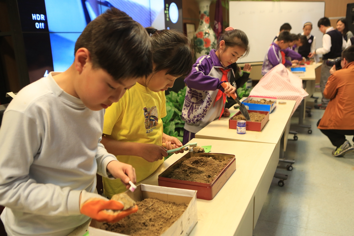 接下来就是最精彩的互动环节——“仿真挖掘现场”。还在介绍活动内容时,底下的同学们就已经“沸腾”了起来。阳抒诚从每班找出一个代表扮演小矿工,每个小矿工都在认真的工作着,台下的同学们也纷纷呐喊加油,现场热闹非凡。