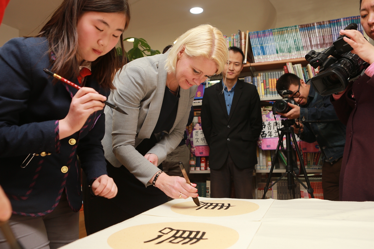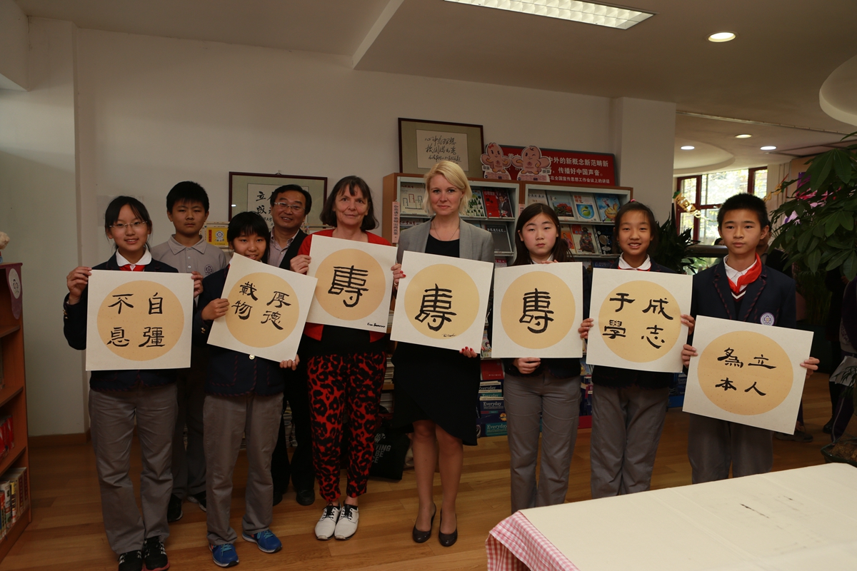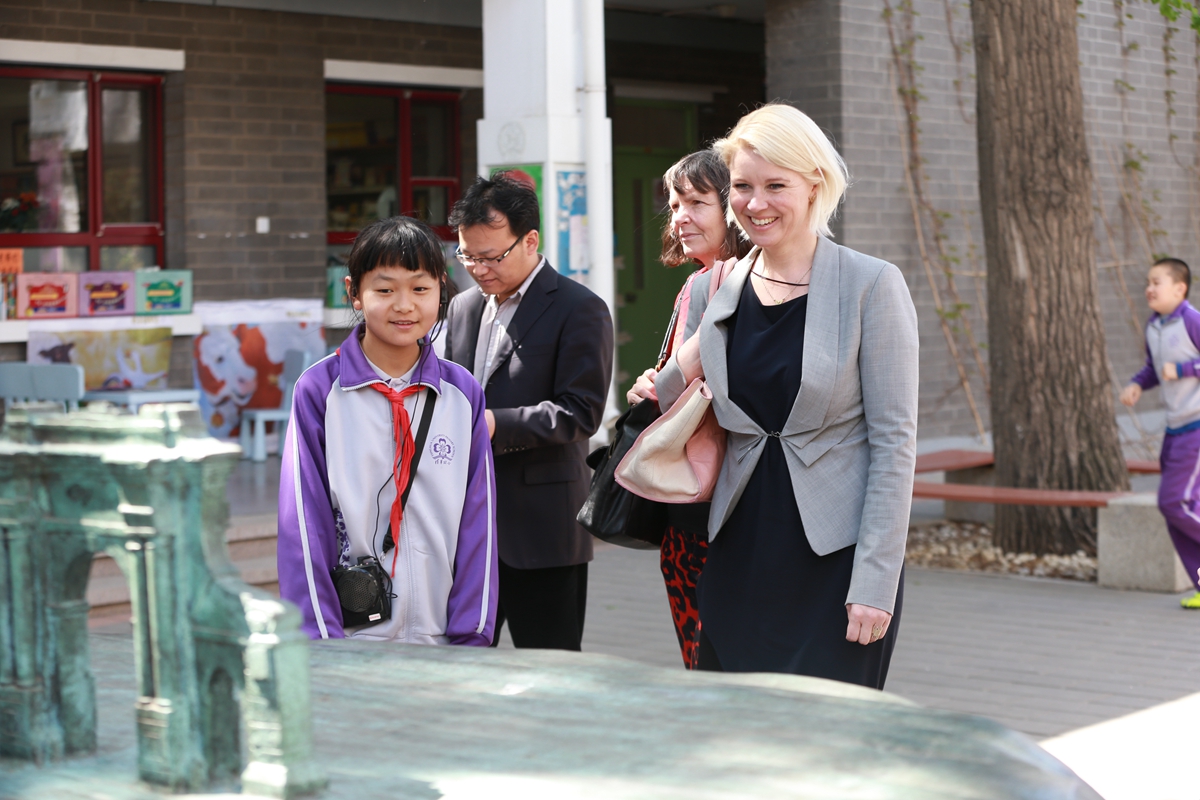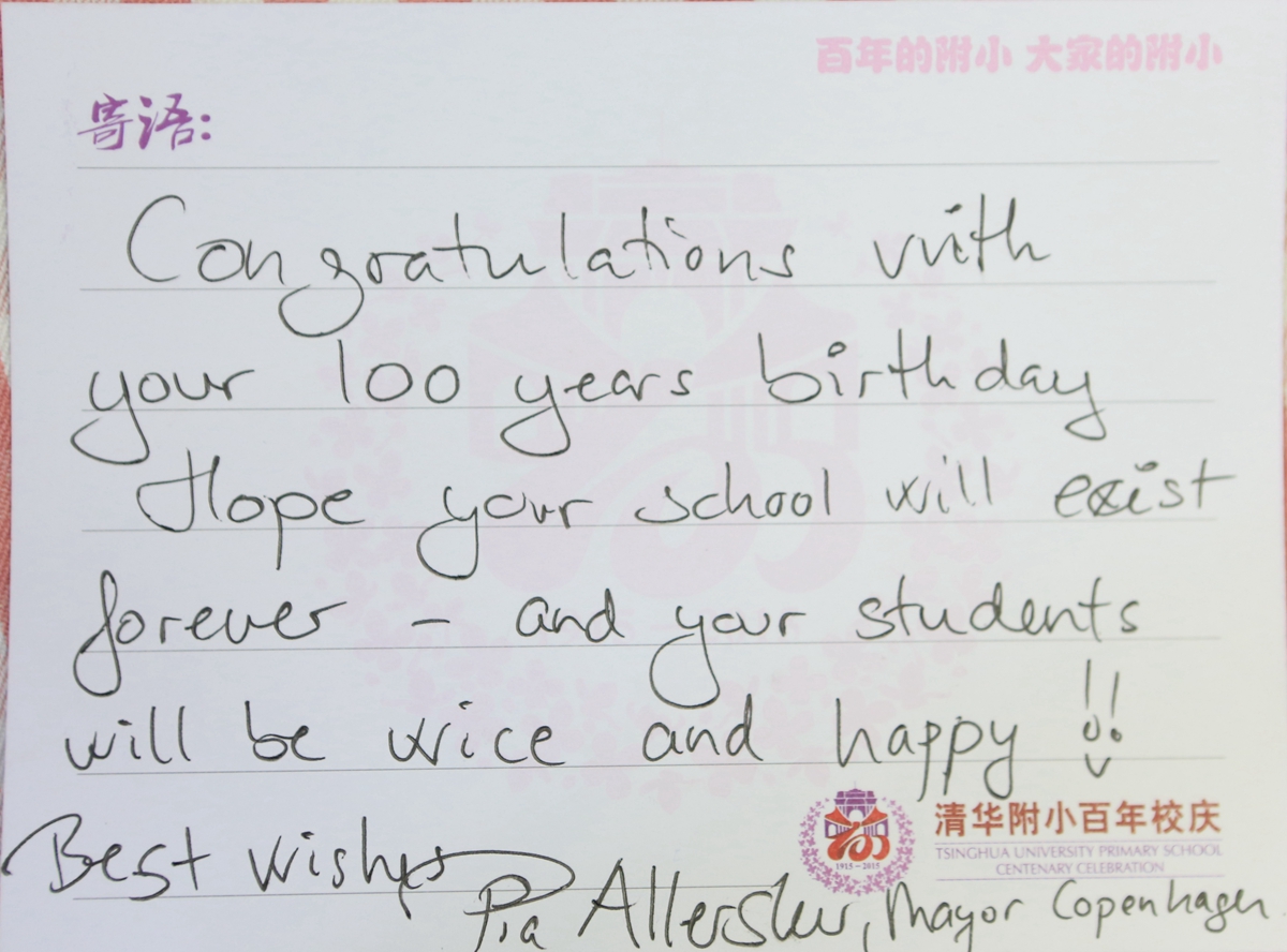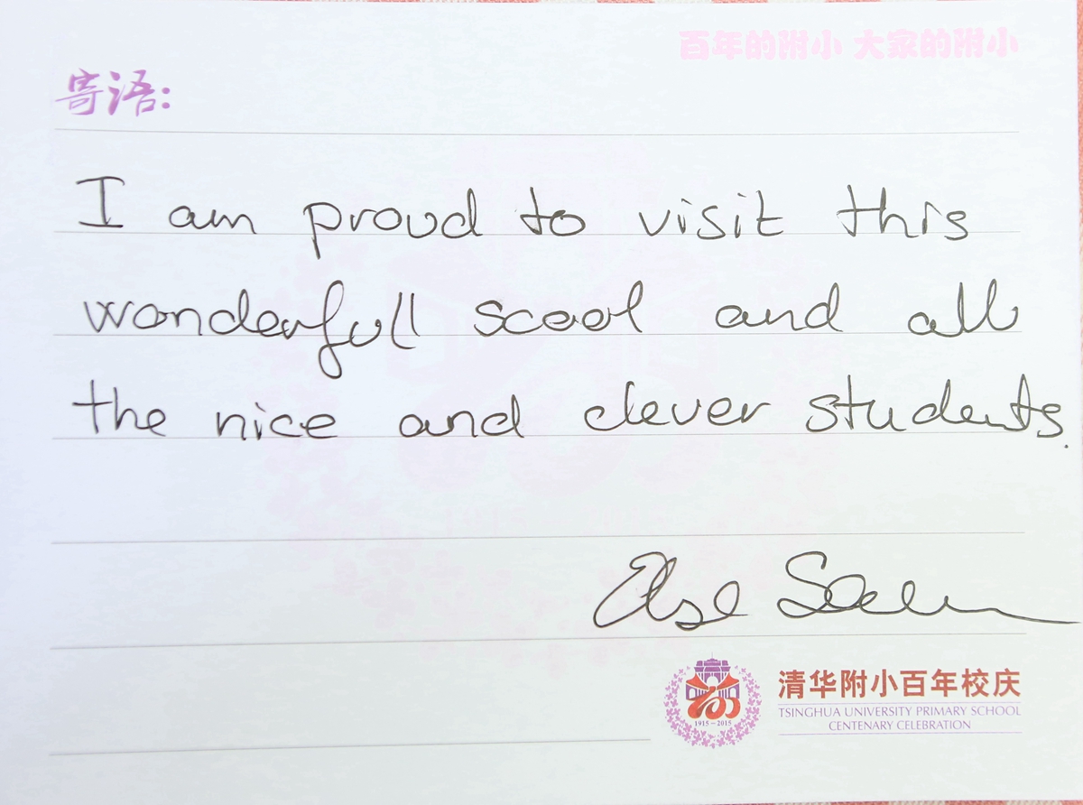 百年附小,杨柳吐绿,在这样一个阳光明媚的日子里,来自丹麦哥本哈根市长Pia Allerslev女士和丹麦官员Else Sommer女士走进清华附小。在“小导游”的带领下,两位女士与同学们一起学写毛笔字、观看音乐剧,感受附小的百年底蕴。