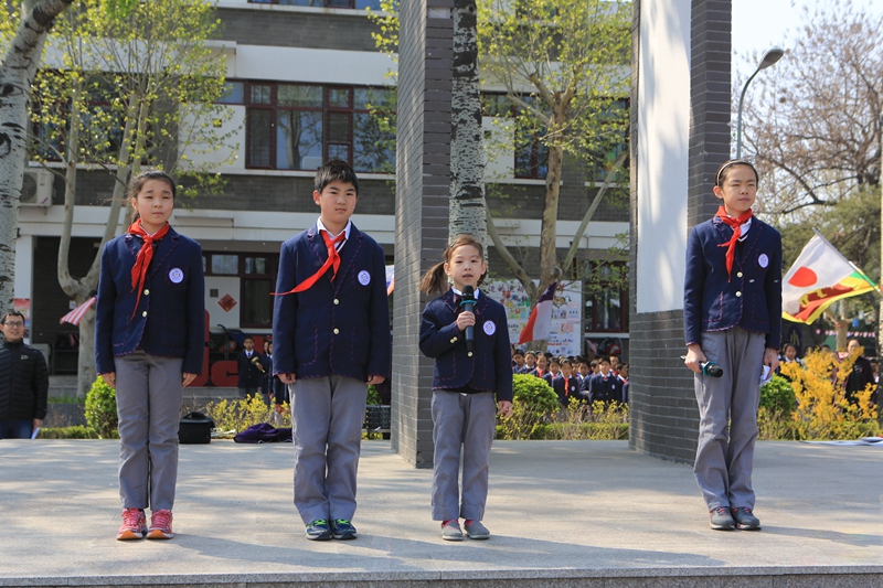 三(1)班的张祖铭,六(4)班的陈静依,一(7)班的石家纬代表全校数百名成功坚持目标21天的孩子们担任荣誉升旗手