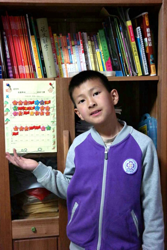 自从全庭亿设定目标,要养成“早睡早起早到校”的好习惯,我突然发现,过去每天都得叫很多次仍不情愿起床的事变成了历史,他几乎每天都能按时去学校晨读了。设定这个目标之初,他把计划表订在书架最显眼的地方,画的很漂亮,上面贴满了自己最喜欢的贴画,记录每天的表现。转眼时间过去四周了,他在早上偶尔还会需要闹钟帮忙,而更多时候,当窗帘拉开,就能看到孩子睁开的大眼睛,轻松愉快的小脸蛋,和迅速穿好校服的阳光少年。每每此时,我都感慨:这就是好习惯的养成,这就是教育的力量,这就是成长!