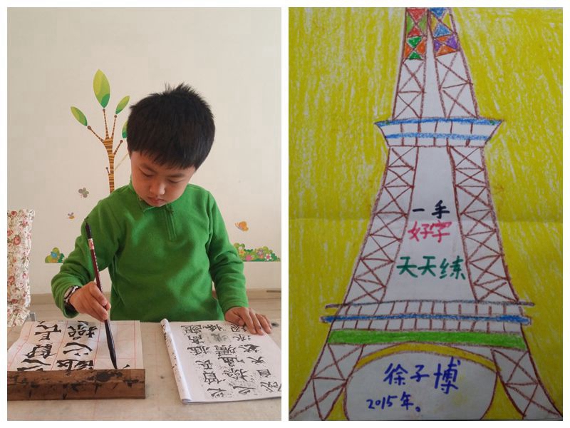 和很多男孩子一样,小徐好动而且专注力不够,很多时候“罔顾左右而言他”不能按时完成任务。一个偶然机会,小徐接触到了书法。虽然同龄孩子写出的漂亮作品引起了他的兴趣,但过去一年他总是无法坚持每天书写,而且书写时还爱分心。自从附小开展“坚持100天”的活动,小徐每天都主动书写30分钟,然后在他的“巴黎铁塔记录表”上画一格自己喜欢的颜色,对于新帖《爨宝子碑》中的笔画还提出了自己的理解。俗话说“字无百日之功”,相信通过100天地坚持,小徐书法和专注力都会得到一定的提高,进而会促进其学习活动的效率。