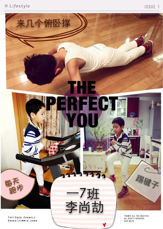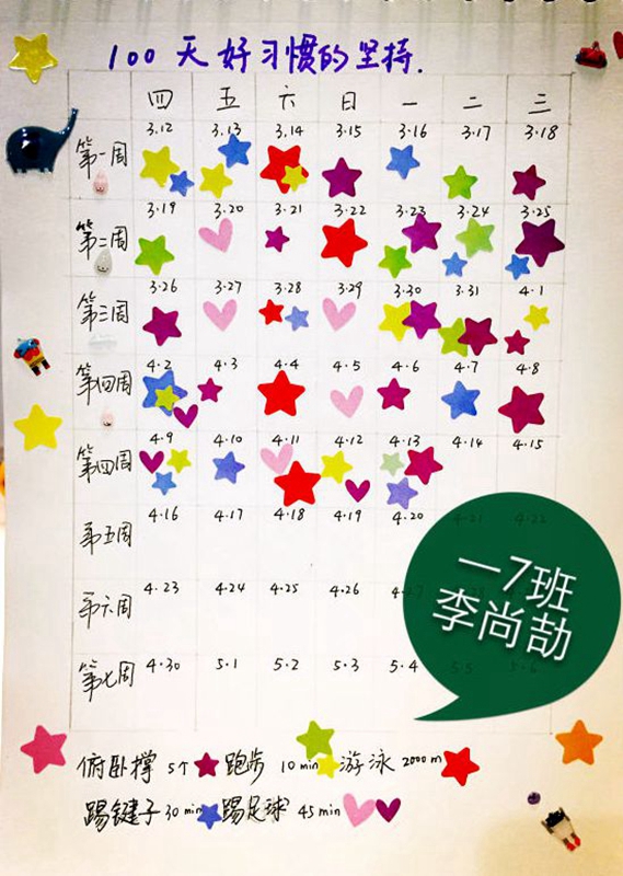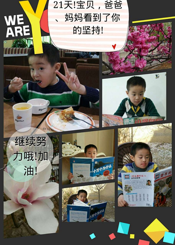 自我监督,自信成长一个月前的一天,孩子回来跟我宣布:妈妈,老师要我们坚持一个行为21天。根据我对他一贯的了解,这事儿十有八九要虎头蛇尾或不了了之。他告诉我,他要坚持每天锻炼身体,我鼓励他持之以恒,坚持就是胜利!当天,他兴冲冲地到跑步机上跑了20分钟,一头汗,我看着他兴奋的小脸,觉得就算坚持不了多久,能做几天是几天也很不错了。接下来,我逐渐淡忘了这个事情,而他却每天仪式般地进行着自己的各种锻炼。锻炼的样式不拘一格,踢球、跳绳、压腿、游泳、踢毽子、蹲马步……21天过去,我早把这件事情忘到脑后,直到有一天看见王老师在班级微信里发布了一张坚持好习惯21天同学合影,当我看到了李尚劼的身影时,那一刻忽然有些小激动。既为孩子的坚持不懈和认真而感动,也对学校老师教育孩子的方式方法感到信服。