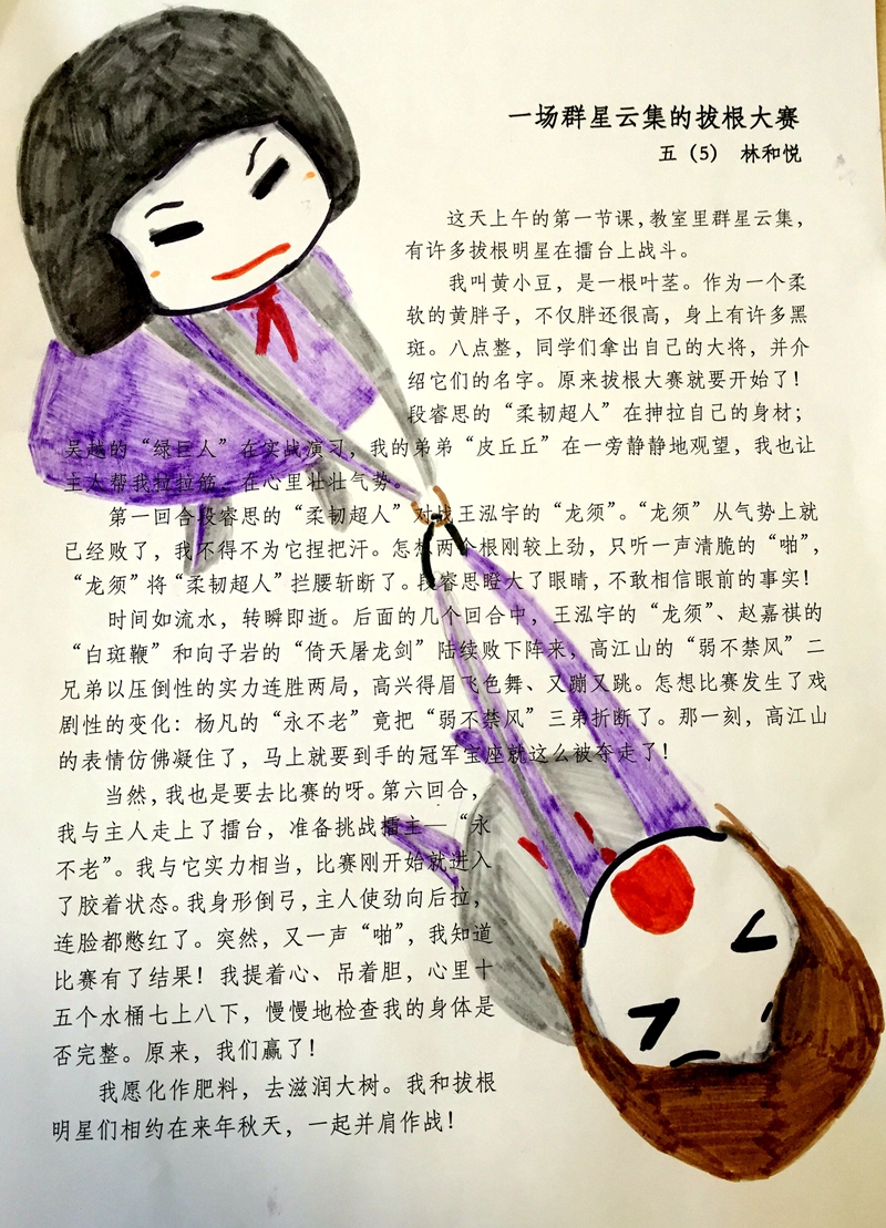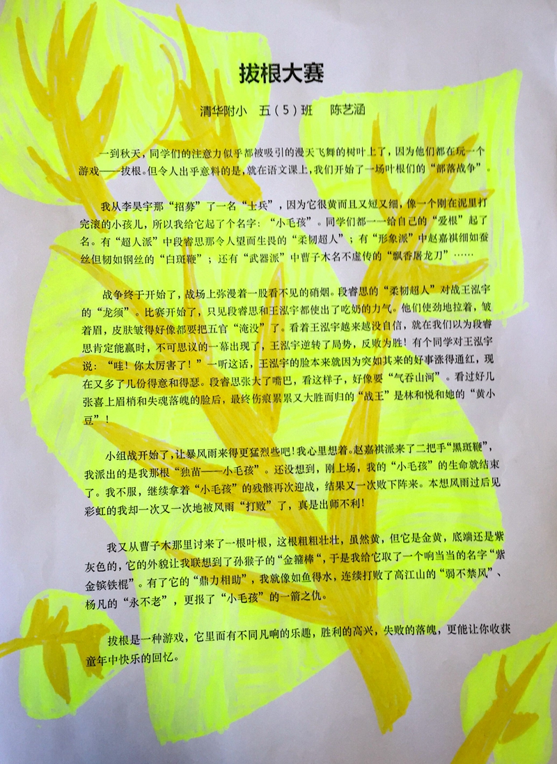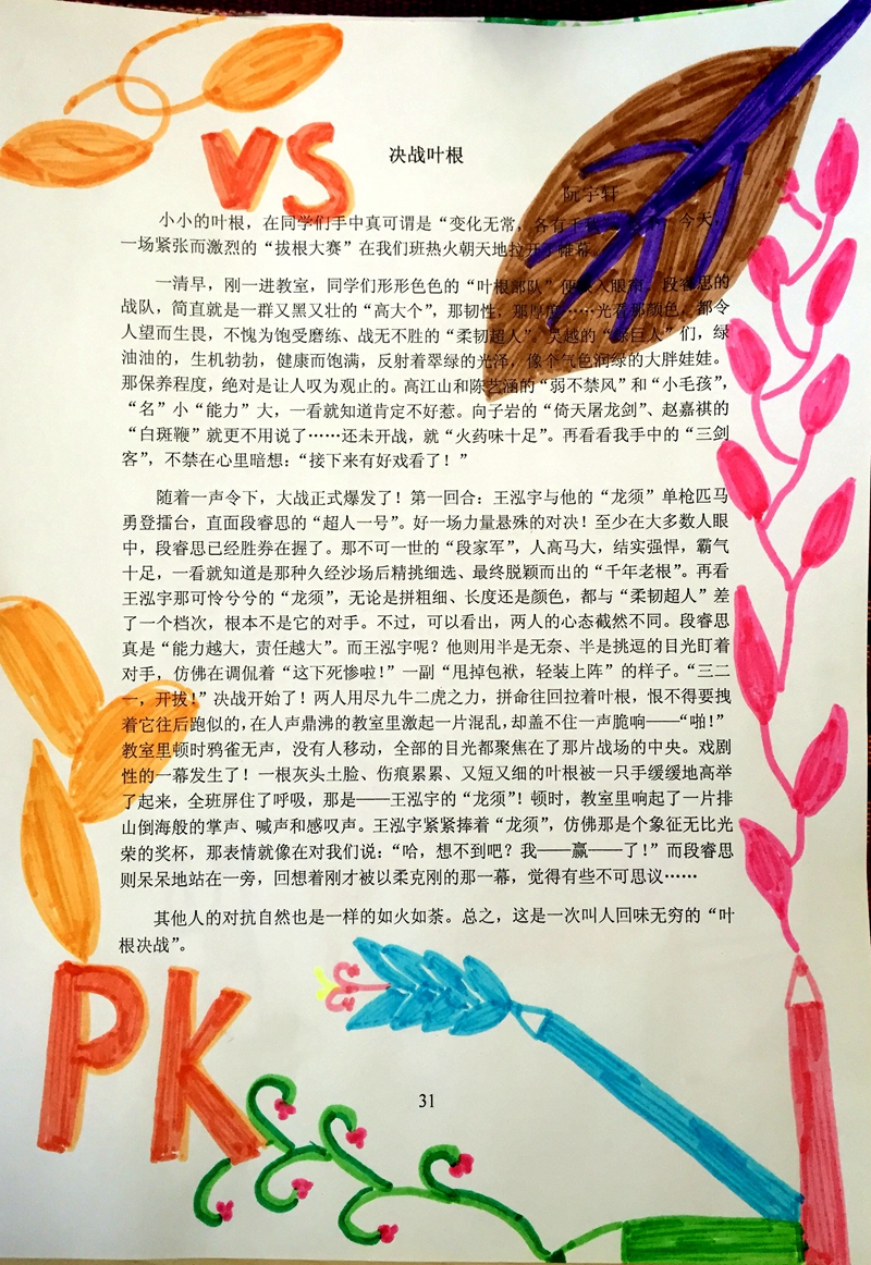 美丽的深秋时节,师生们看着校园中满是从杨树枝上飞舞下来的宽大落叶,不约而同地尝试玩“拔根”游戏,写“拔根”的念头也油然而生。“行胜于言”,首先布置“体验式家庭作业”:回家寻找和挑选自己的“根队”;给自己的“根将领”们取好名字;各小组自己举行初赛,选出获胜队员。“爱玩是孩子们的天性。”同学们听后热情高涨,都积极体验着其中的乐趣。情感这样的投入,自然就会不吐不快了!师生在课堂上时刻碰撞出很多智慧的火花。