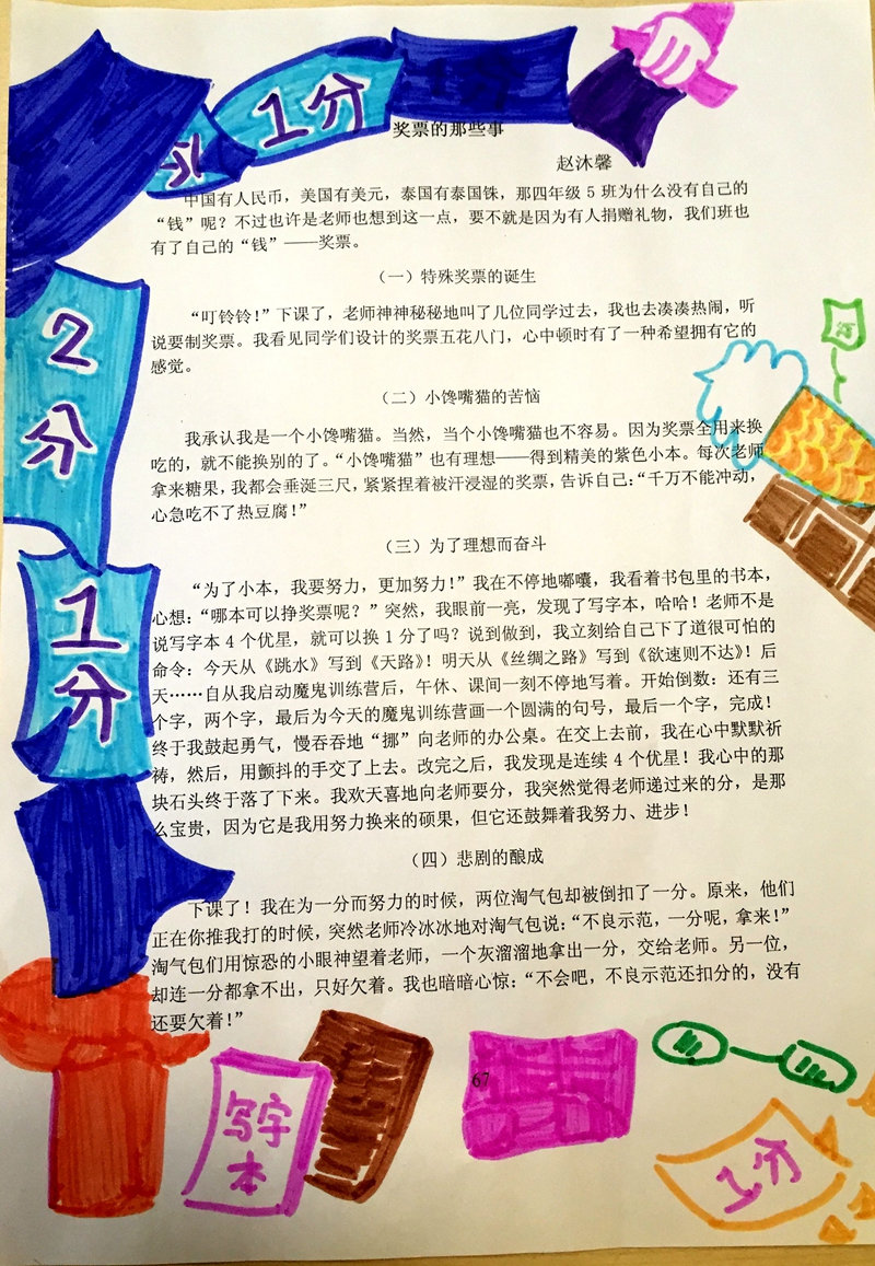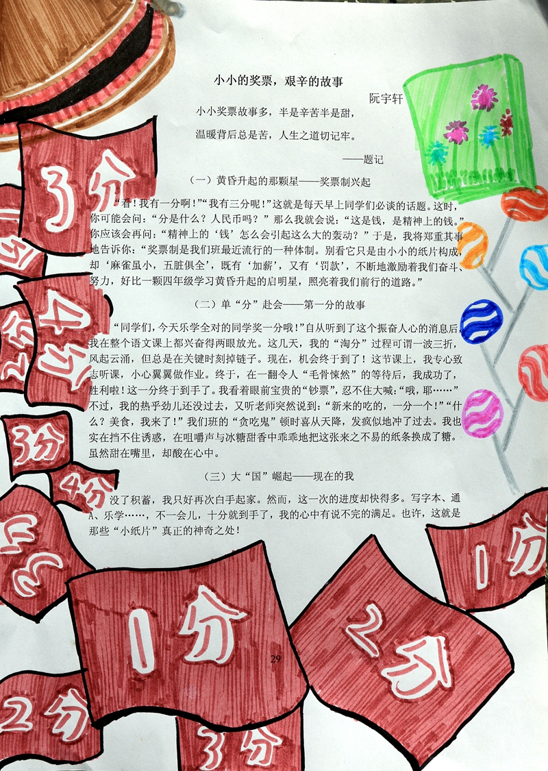 “小小奖票故事多,半是辛苦半事甜,温暖背后总是苦,人生之道切记牢。”这几句话是五5班的一位同学写在他的《小小奖票,艰辛故事》前的题记。读后,我们就可以深深地感受到这小小奖票的威力。还是在四年级的时候,全体师生将班级管理中引进了“挣奖票换奖品”的管理方法。奖票由擅长绘画的同学设计,面值有5分、2分和1分,根据不同的优秀行为进行不同的分值奖励,积攒到一定的分值可以兑换自己喜欢的奖品。奖票制度实行了一段时间之后,一节作文,她当堂以“奖票的故事”为主题练习习作,让我们欣喜的是孩子们的酸甜苦辣的体验是那样的真切!我们先来看同学们这次习作的题目:《黄昏升起的那颗星---奖票制的兴起》、《单“分”赴会---第一分的故事》、《大“国”崛起---现在的我》、《握在手里的酸甜苦辣》、《小馋猫的苦恼》和《擦肩而过的一分》……我们不读文章,单单看这些富有情感的题目就让人觉得有趣了。有人说:“习作是生活的倒影。”是啊,先要让同学们的生活有故事,他们的笔下才能写出自己的生活。