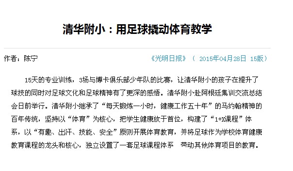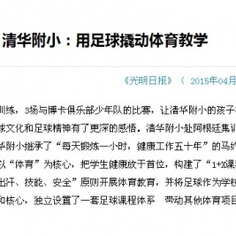 15天的专业训练,3场与博卡俱乐部少年队的比赛,让清华附小的孩子在提升了球技的同时对足球文化和足球精神有了更深的感悟。清华附小赴阿根廷集训交流总结会日前举行。清华附小继承了“每天锻炼一小时,健康工作五十年”的马约翰精神的百年传统,坚持以“体育”为核心,把学生健康放于首位,构建了“1+X课程”体系,以“有趣、出汗、技能、安全”原则开展体育教育,并将足球作为学校体育健康教育课程的龙头和核心,独立设置了一套足球课程体系,带动其他体育项目的教育。
