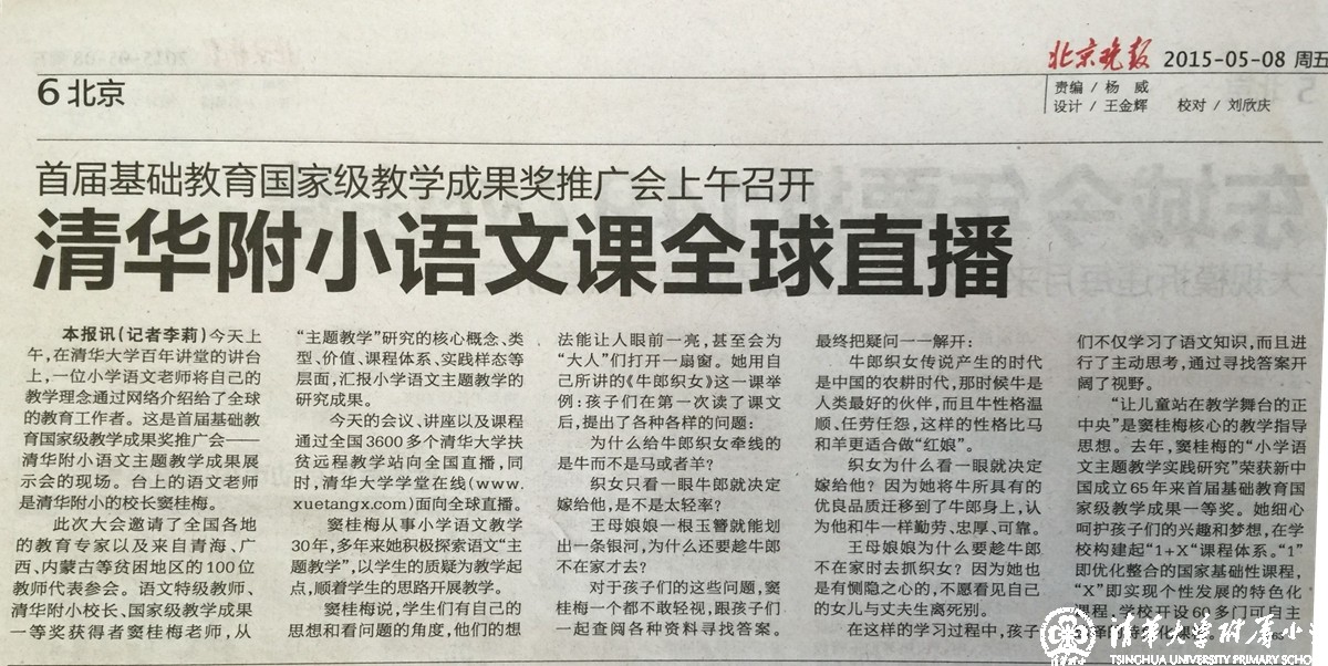 本报讯(记者李莉)今天上午,在清华大学百年讲堂的讲台上,一位小学语文老师将自己的教学理念通过网络介绍给了全球的教育工作者。这是首届基础教育国家级教学成果奖推广会——清华附小语文主题教学成果展示会的现场。台上的语文老师是清华附小的校长窦桂梅。