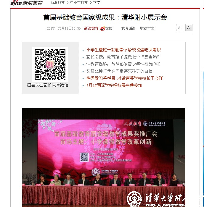 5月8日,由教育部责成人民教育编辑部主办的首届基础教育国家级教学成果奖推广会——清华附小语文主题教学成果展示会,在清华大学[微博]大礼堂隆重召开。