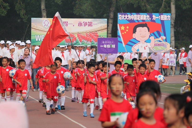 无足球,不快乐!足球微社团,把小队员放到了运动场正中央。新学期一开始,已经逐渐熟悉了校园生活的同学们,开始了对足球运动的热爱与追求。一(1)班足球微社团就这样成立了。大家齐心协力设计了队徽,凝炼了口号。每周六早上,附小足球场上都跃动着他们训练的英姿。“一年一班,非同一般!一一得一,勇争第一”,这响亮的口号激励着每一位同学奋勇拼搏、为班级荣誉而战!在附小运动会入场式上,一(1)班全体同学身着中国红队服、面贴五星红旗,英姿飒爽、斗志昂扬代表中国队是一(1)班的荣耀!为中国足球助力和加油是一(1)班的愿望!