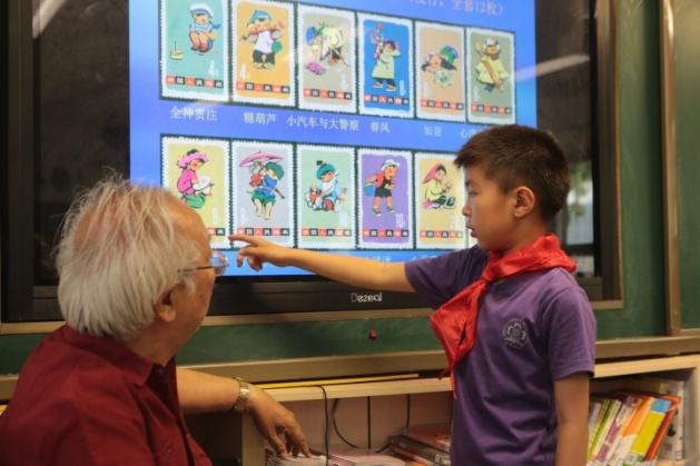 别看李爷爷头发已经花白了,他讲课可有趣了,他告诉我们什么是集邮、集邮的意义,还给我们讲了古代的邮票,外国的邮票,邮票的要素,邮品的分类……他真是太了不起了!他还鼓励我们绘制属于我们自己的邮票。