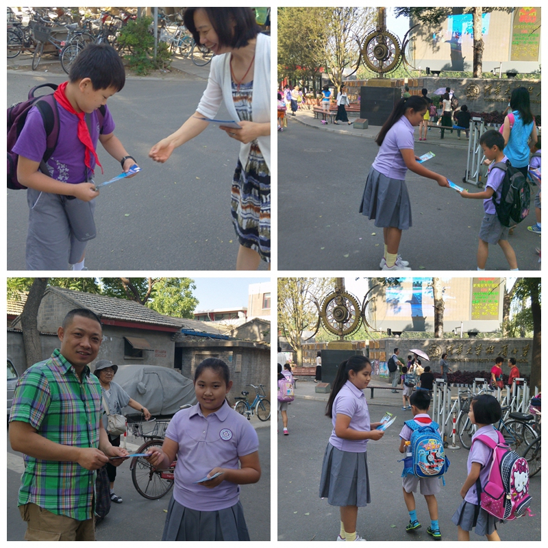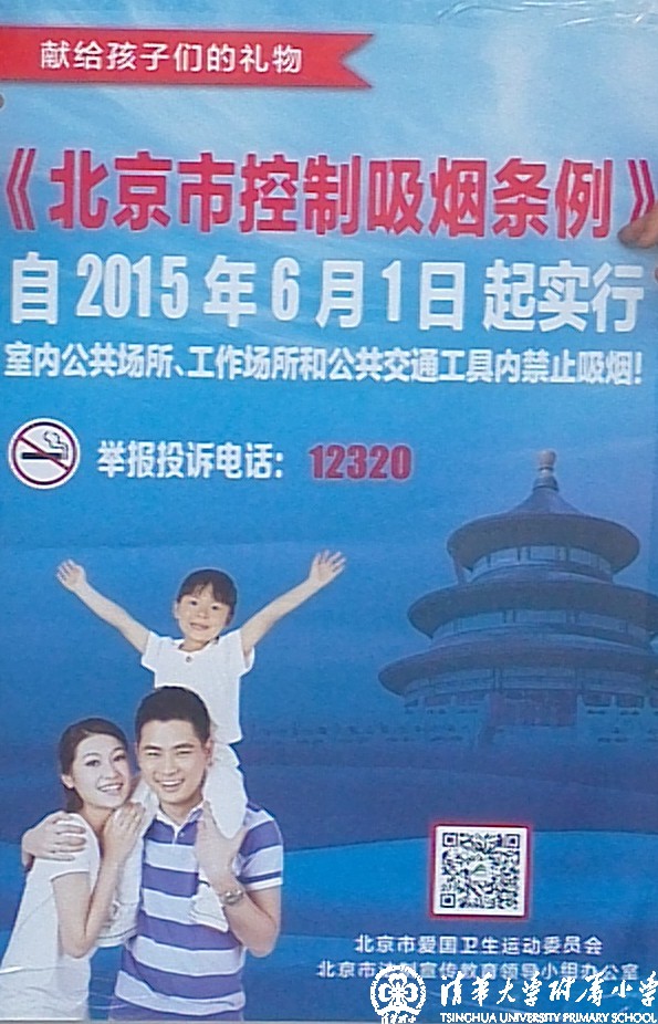 在《北京市控制吸烟条例》开始实施之时,清华附小师生积极开展宣传活动,6月3日清晨,罗侠大夫带领同学们在学校大门口给学生及家长发放宣传材料。