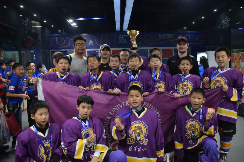 清华附小冰球队的座右铭是:宁可输在球上,绝不在精神上!不畏强敌,在去年乙组亚军的好成绩基础上,我校首次选派14名队员参加冰球联赛最高水平的竞技组比赛。