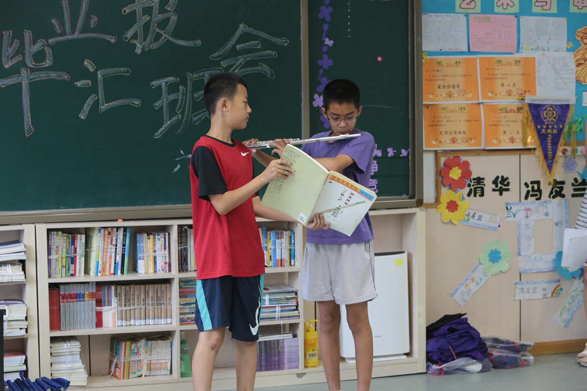 一时间,修远楼成为了欢乐的海洋,同学们的才艺展示应有尽有:有变魔术的,又吹长笛的,有演情景剧的,有唱歌跳舞的,有写书法的……毕业班级的个性展示,基本涵盖这几个环节:学生讲毕业课程的收获和讲课程故事,然后是才艺展示,然后每一个班都有自己独特的活动环节,如:集体诗歌朗诵,表达对母校的眷恋;学生说相声,表达在课程里的成长;男女生辩论——是男生优秀还是女生优秀;亲子互动节目,同时向家长与同学提问:如对方生日,喜欢什么?来检验亲子之间的默契程度,从而教会孩子尊重感恩;还有在五年级时,班级被点招的同学回到自己的毕业班,互诉同窗情谊,共同见证毕业,场景再度感动着每一个人。