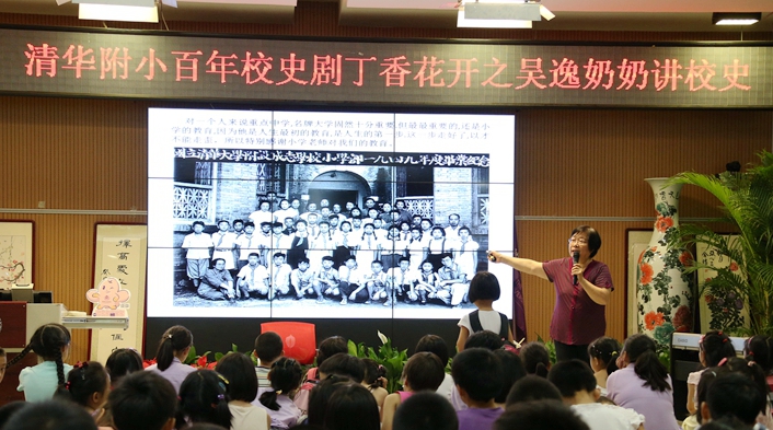 百年的清华附小一直和国家、民族的命运休戚与共。一部清华附小的校史,反映着中国人民在中国共产党的领导下,追求解放,追求和平,追求独立的沧桑历程。为了让同学们更加深入地了解反法西斯战争和抗日战争的背景和历史,特地为正在排练校史剧《丁香花开》的小演员们请来研究清华附小校史的老校友吴逸奶奶讲述校史,讲述校友们在西南联大时期,如何在日本敌机轰炸的背景下,发扬刚毅坚卓的联大精神,刻苦学习,立志报国的故事。同学们个个听的非常投入,讲到老校友黄宁因为跑警报倍受日本战斗机的欺凌,立志报国,要造出中国人自己飞机的故事时,更是热泪盈眶。
