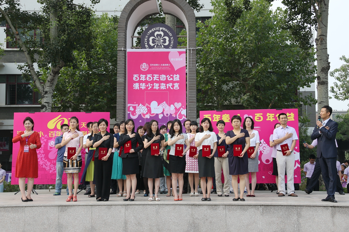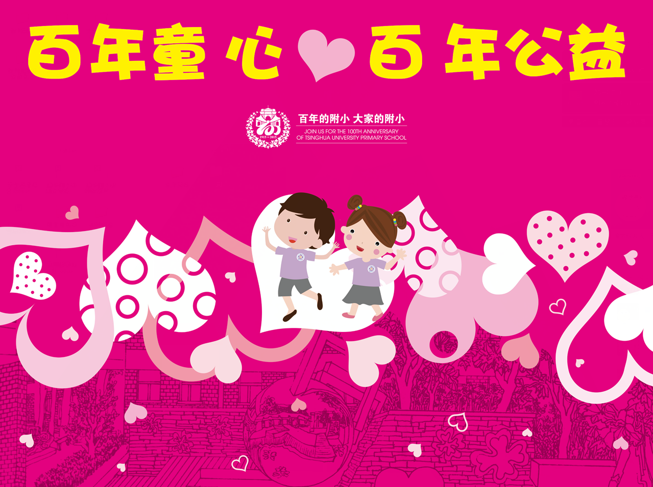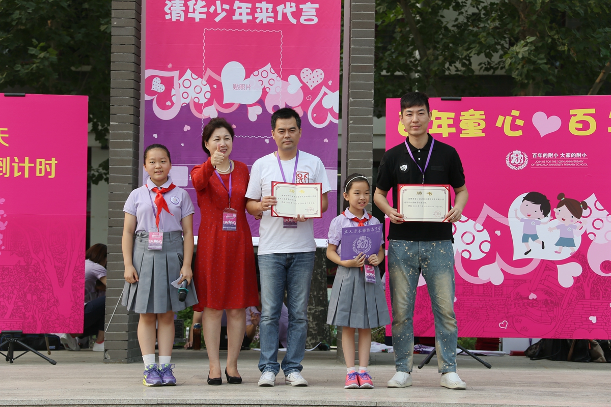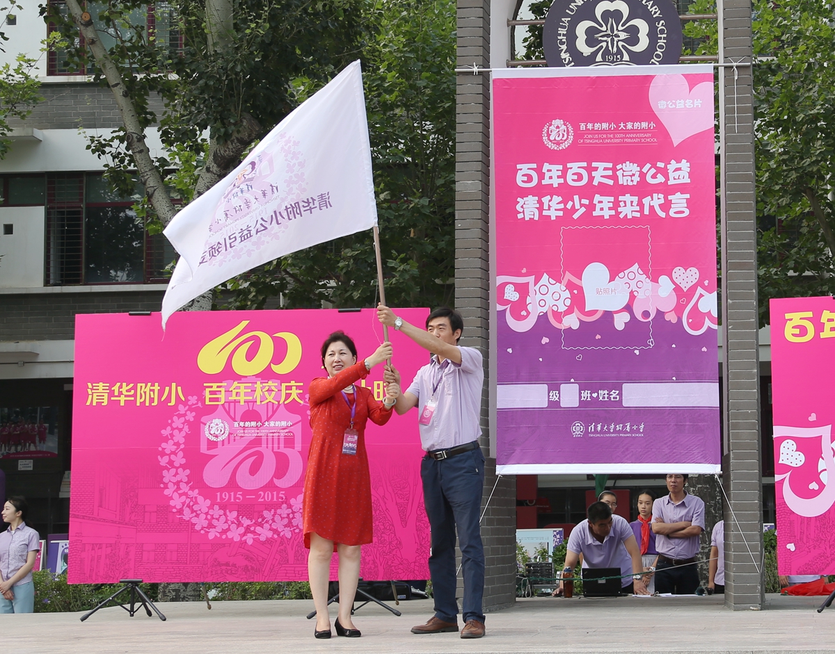 百年校庆倒计时100天教育活动仪式上,清华附小的公益形象大使赵嘉君同学向全体同学、老师、家长和各界校友发出倡议,共同参加“百年百天微公益,清华少年来代言”活动,从身边的公益小事做起,践行家国情怀的追求,为清华附小的百年校庆助力。清华附小还邀请了两位著名公益嘉宾邓飞、央视著名主持人毛毛虫,并聘任两位担任学校的公益教育形象大使。他们两位将和家长、同学们、校友们一起参加“百年百天微公益“活动,为清华附小百年校庆助力。