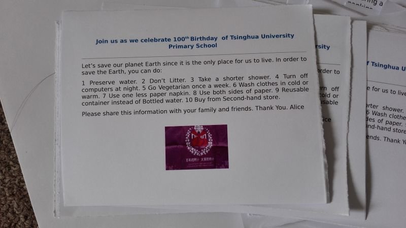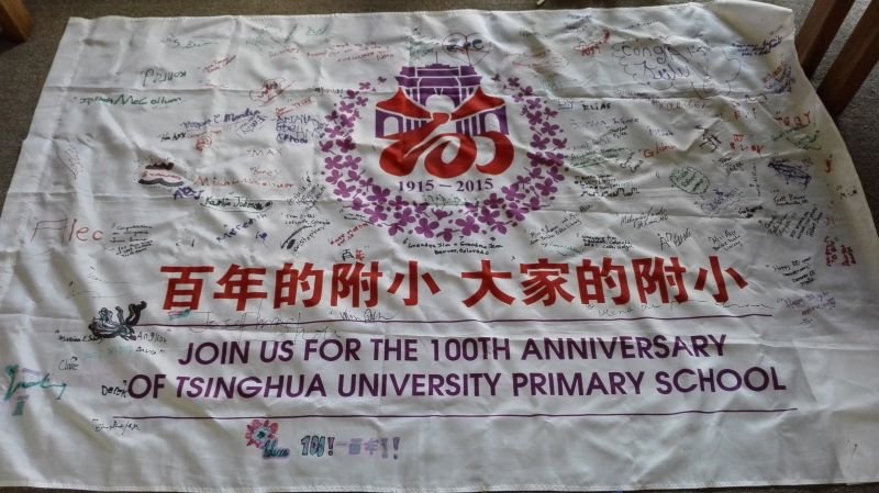 我向妈妈提议:“妈妈, 我们做好多好多贺卡, 上面写着‘庆祝附小100岁啦’,再告诉大家要保护地球,然后发给大家。”妈妈说这个主意不错。我们制作了100 多张明信片,分发给大家。并且分别请大家在清华附小校旗上签名,支持公益,为清华附小祝寿。我弟弟也一直跟着凑热闹呢!
