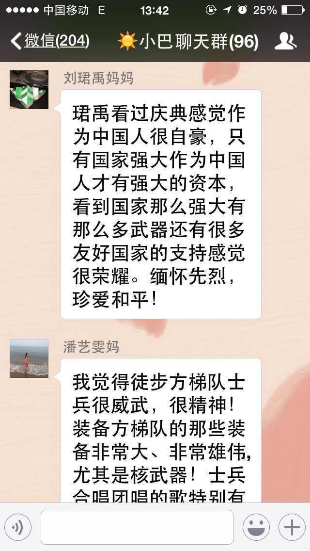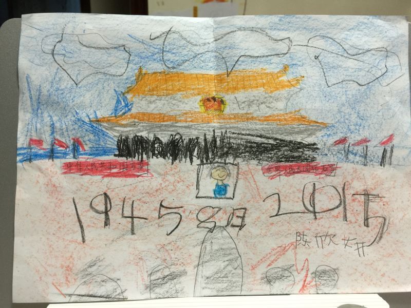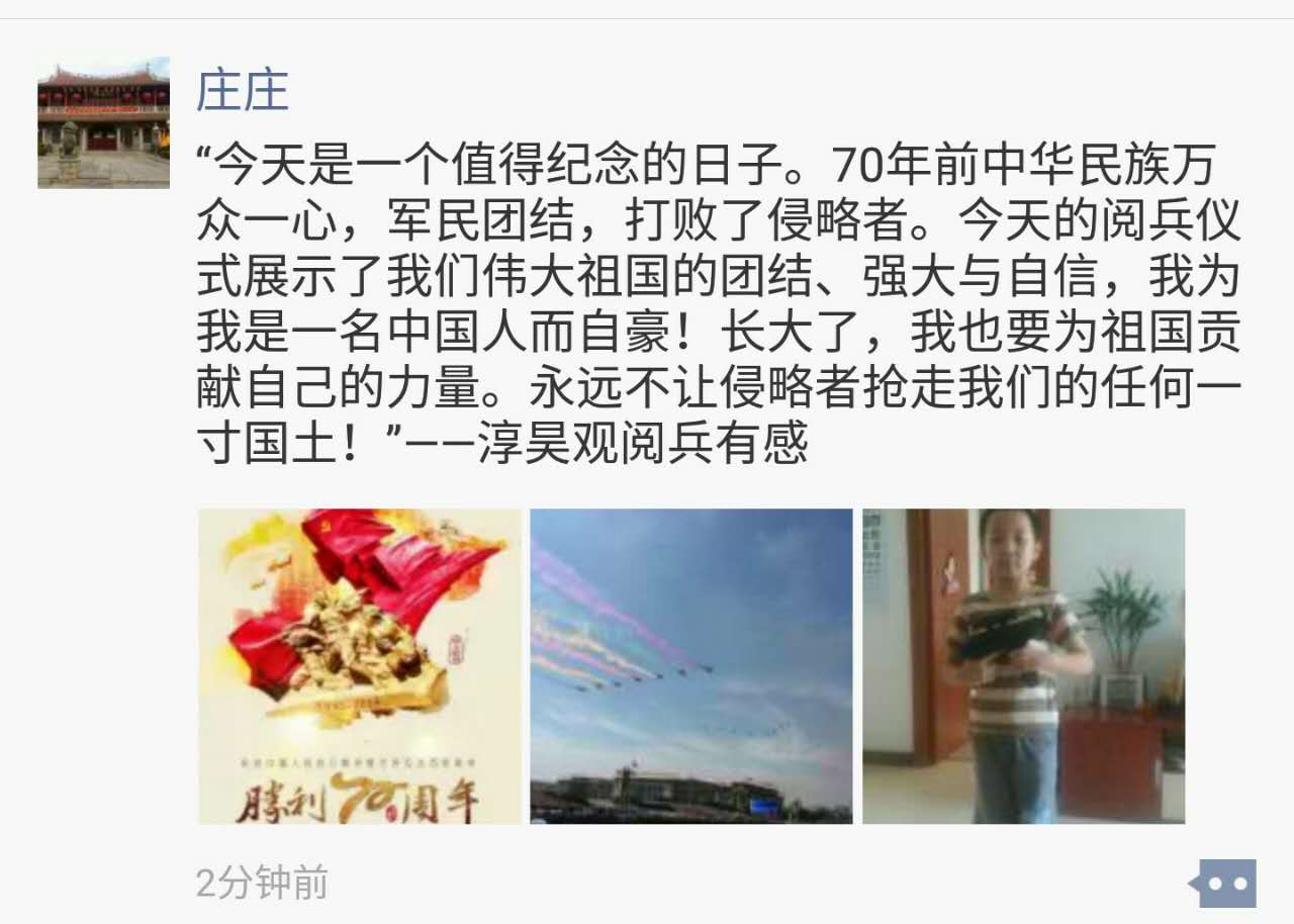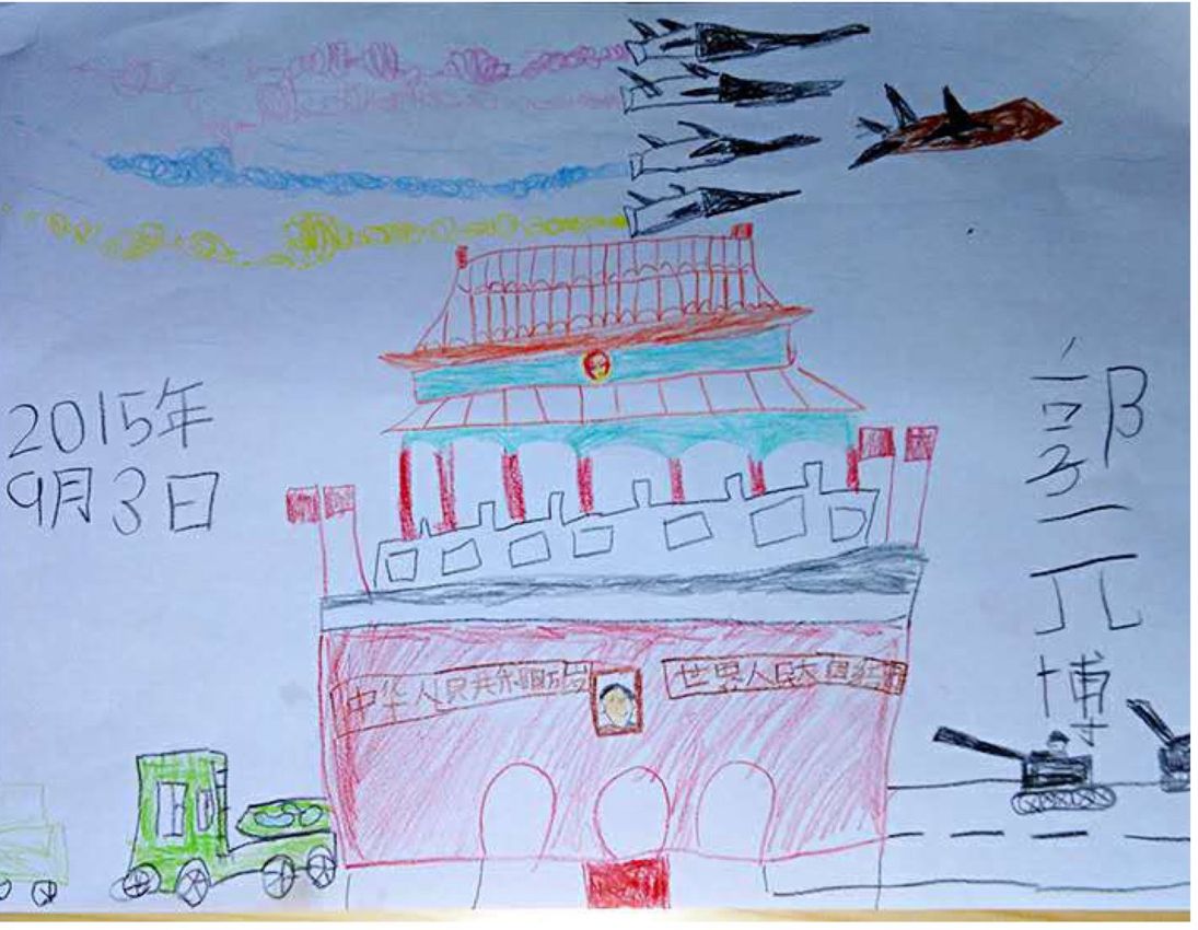 今日我们之所以能享有教育,父母的爱,和快乐的游戏玩耍,都是那些勇敢无畏的先辈在抗日战争中的浴血和生命抗争换来的。和平怎么传承?看看今天阅兵的叔叔阿姨!他们一个个英姿飒爽,目光炯炯,气势坚不可催。看看那先进的武器吧,它们是现代和平的守护者!叔叔阿姨为我们赢得了长身体和本领的和平空间和时间,我要快快学习,长本事!