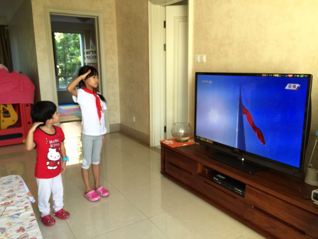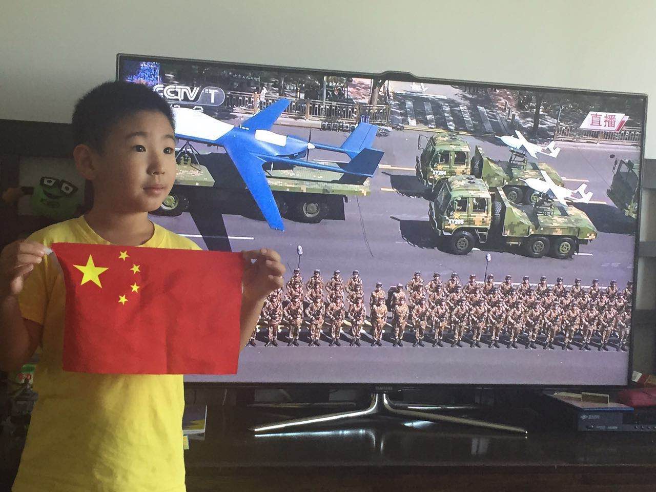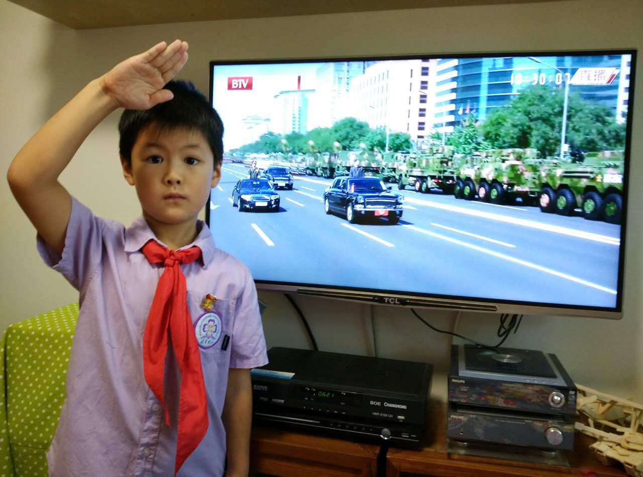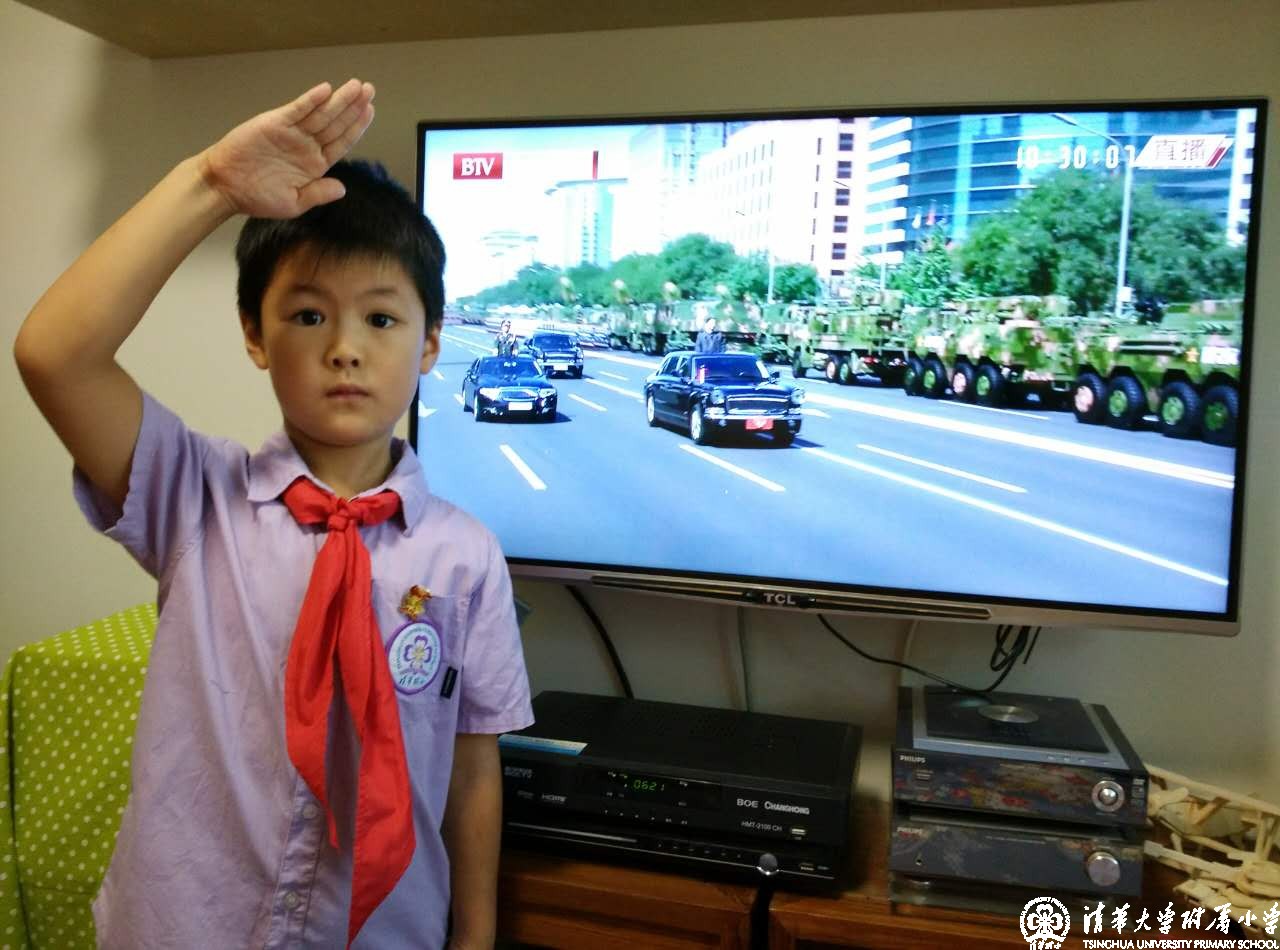 一大早我们全家就早早等在电视机前,看着习爷爷接见各国元首,听着军乐团演出嘹亮军歌,我的心情一点点激动起来。等来宾们都站上城楼,李克强爷爷宣布阅兵式开始,我忽然灵机一动,赶紧从沙发上弹起,三步并作两步地冲到屋里,抓起红领巾恭恭敬敬地系好,正好赶上升国旗奏国歌。我对着电视肃立,行着少先队礼唱完了国歌。