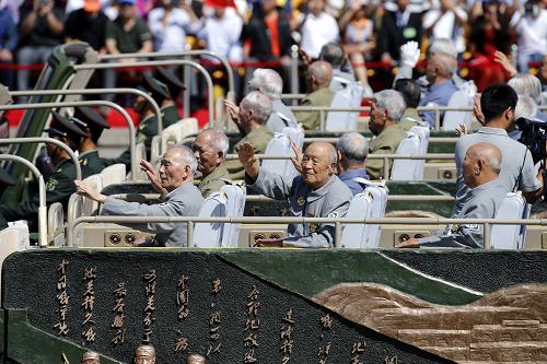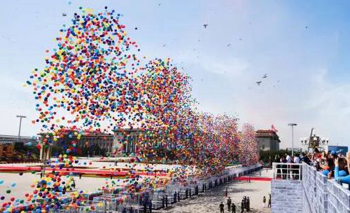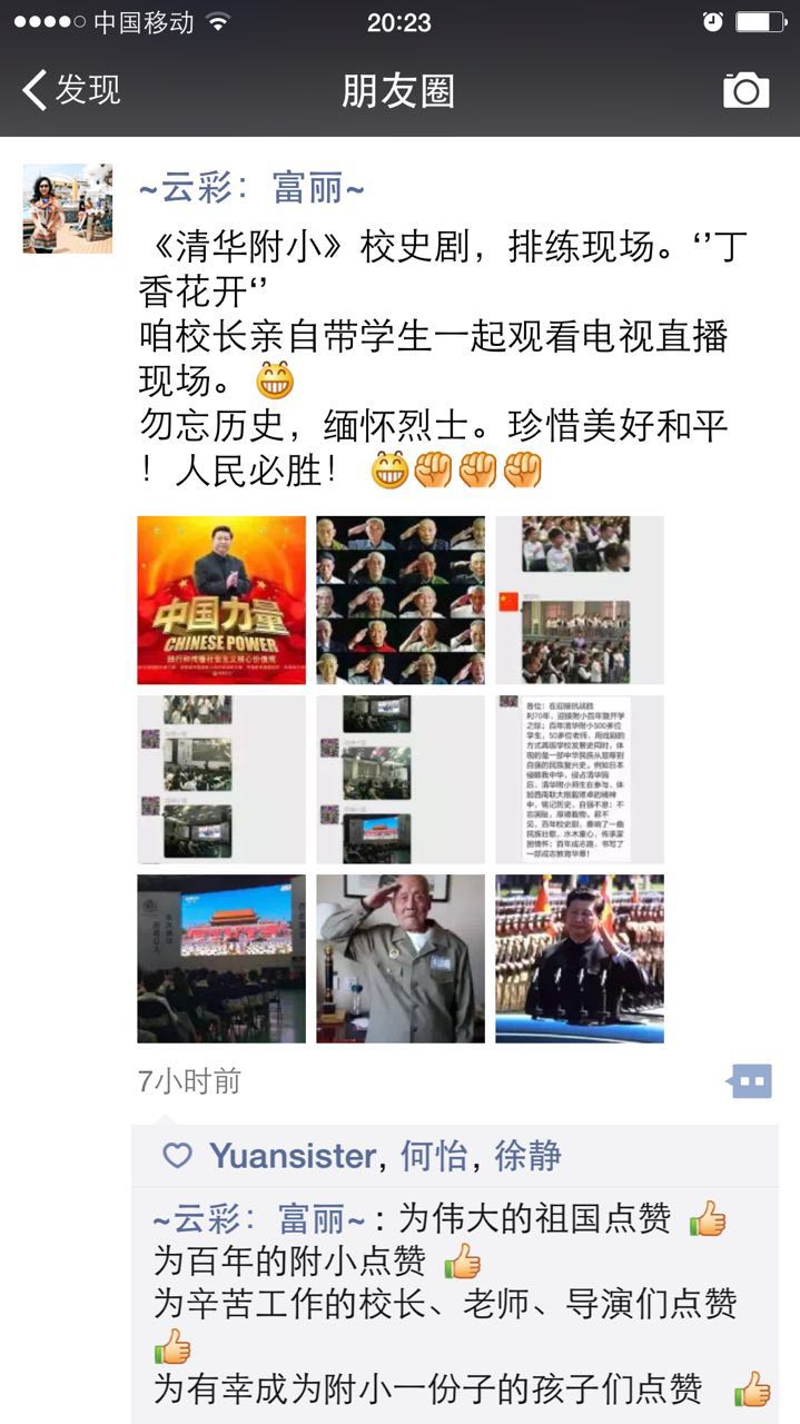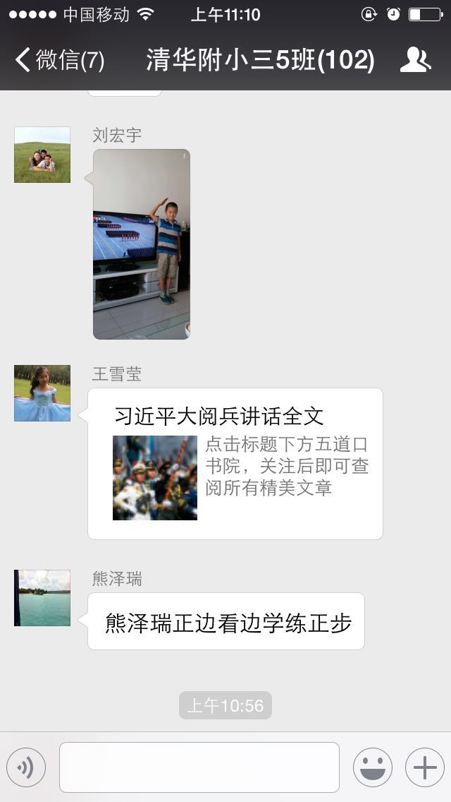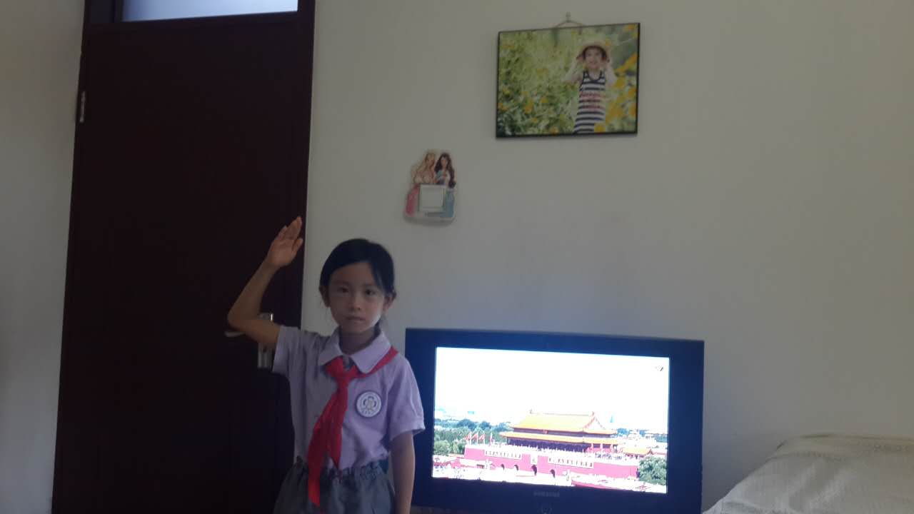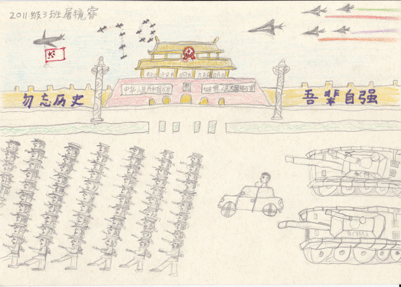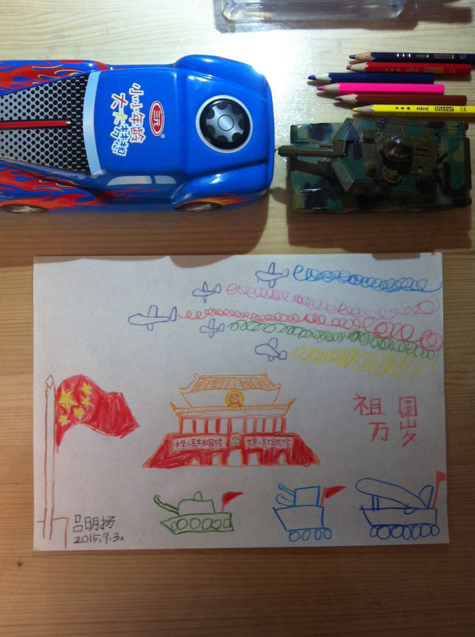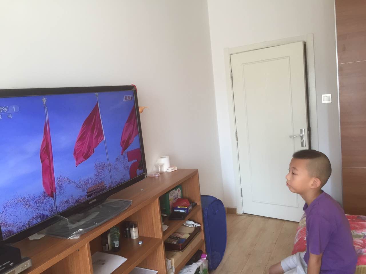 一大早我们全家就早早等在电视机前,看着习爷爷接见各国元首,听着军乐团演出嘹亮军歌,我的心情一点点激动起来。等来宾们都站上城楼,李克强爷爷宣布阅兵式开始,我忽然灵机一动,赶紧从沙发上弹起,三步并作两步地冲到屋里,抓起红领巾恭恭敬敬地系好,正好赶上升国旗奏国歌。我对着电视肃立,行着少先队礼唱完了国歌。