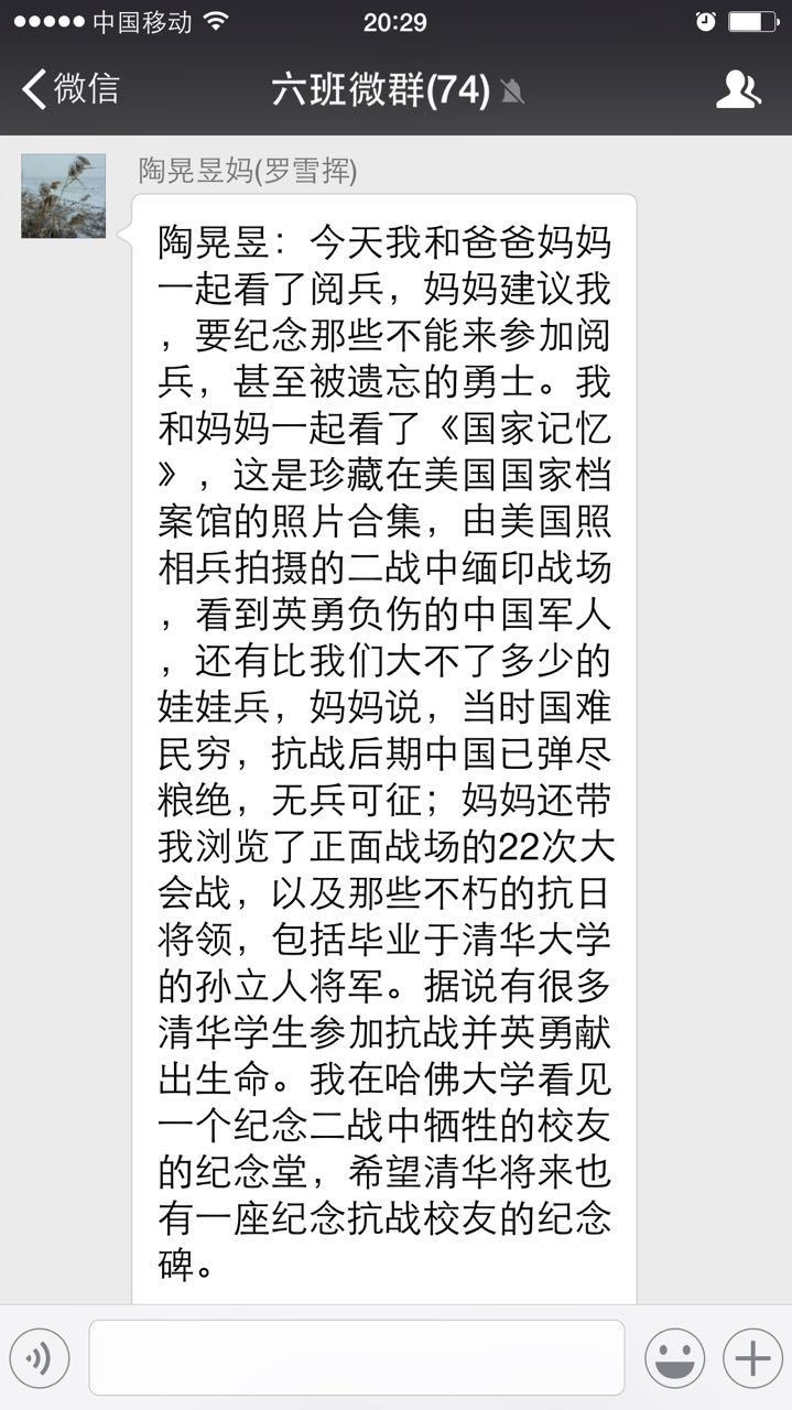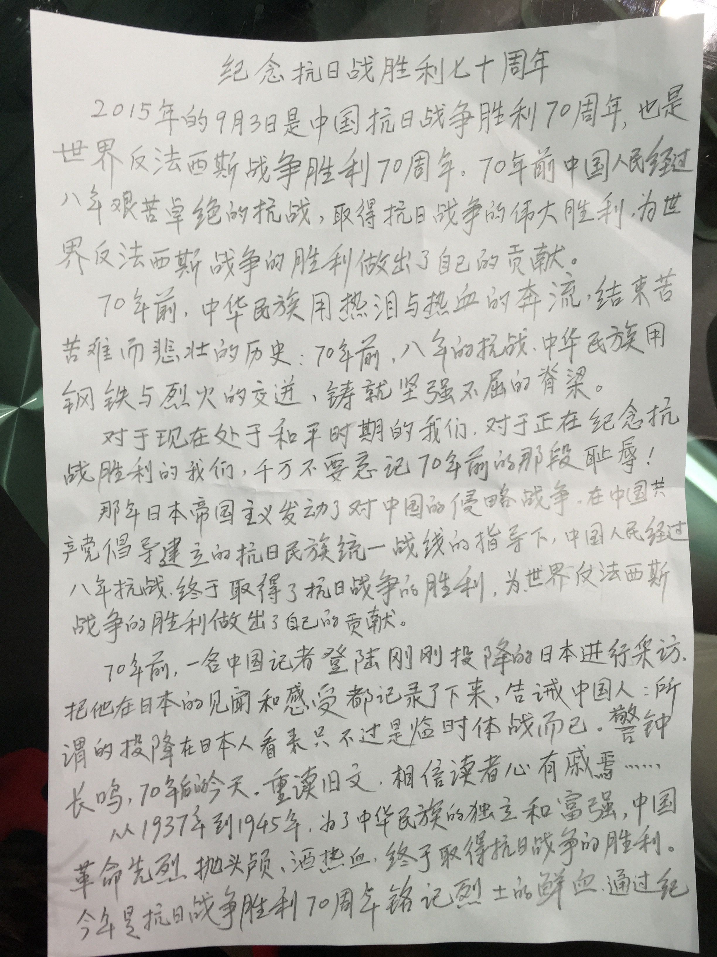 如今我们祖国的军事力量越来越强大了,有反坦克导弹车、无人机等很高级的军事设备。但是我们也应该知道在抗日战争时期,我们国家艰苦的一段时期。对于反法西斯胜利七十周年有一句话:铭记历史,共创未来。我们应该多了解一些我国军事知识,这样可以开阔自己的视野,知道更多国家大事和全世界的新闻动态。