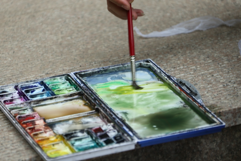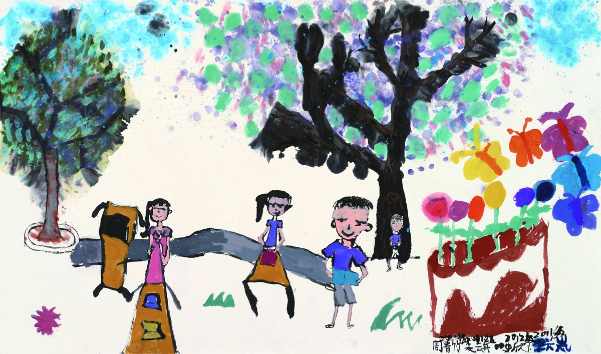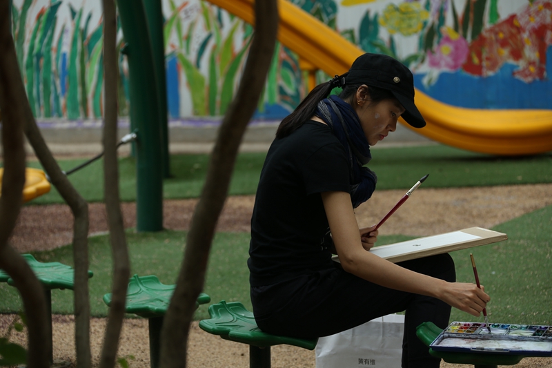 华宇池畔。一个孩子站在一位画家旁边,认真地看着画家作画。突然雨滴掉了下来,孩子盯着画家作品里的“天圆地方”被雨滴晕染开了,孩子着急地跑回班,拿下来了雨伞,替画家撑起了一个安全的作画小窝。画家笑了,孩子也笑了,这是雨中最美的风景。雨后放晴,画家郑重地把在自己的画上签下自己的名字,把被雨色晕染的美丽图画赠送给了孩子,孩子也把自己的画作送给了画家,大家相视而笑,其乐融融,画家高兴地称孩子为小友,孩子捧着画家的作品也兴奋地跳了起来。