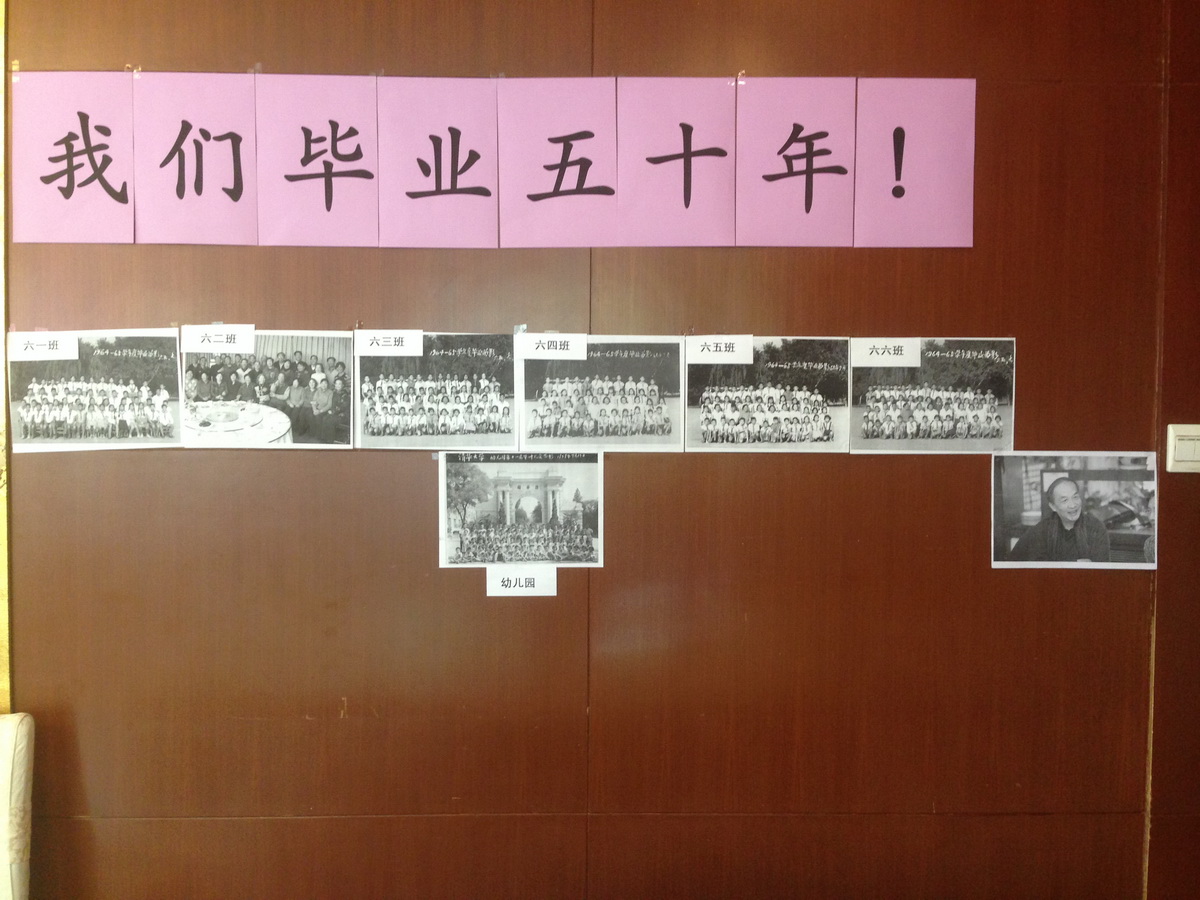 五十年后第一次相见,见面相认,欣喜的声音不断响起。大家驻足在毕业合影前,寻找自己的身影,共话童年往事和情谊,追昔抚今,感慨万千。