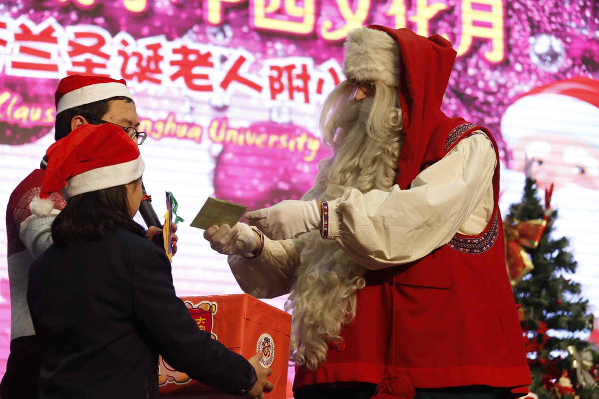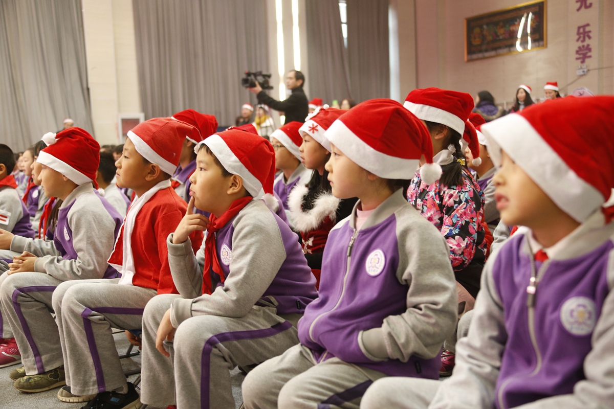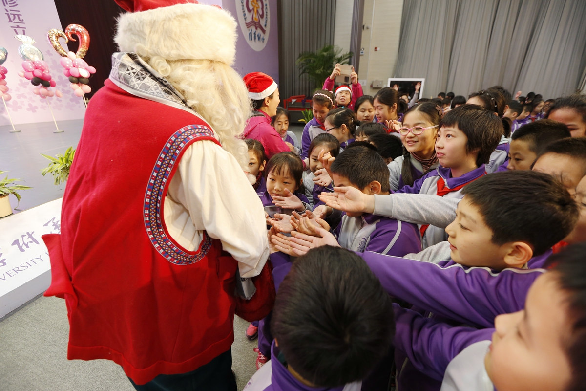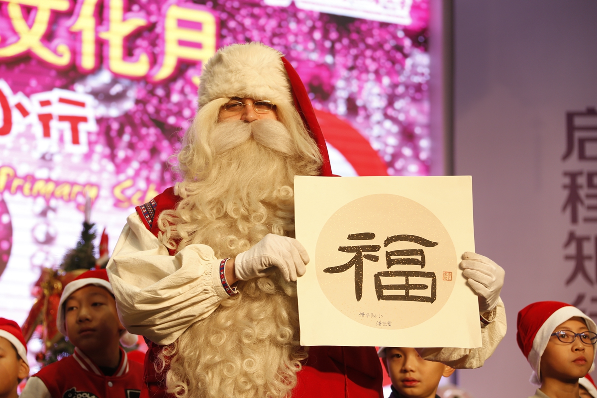 热情好客的“小东道主”,也有礼物要送给圣诞老人呢!瞧,同学们亲笔书写的“福”字,将新春的喜庆带给远方的朋友;别致的附小丝巾,也给圣诞老人的传统着装增添了附小的元素!