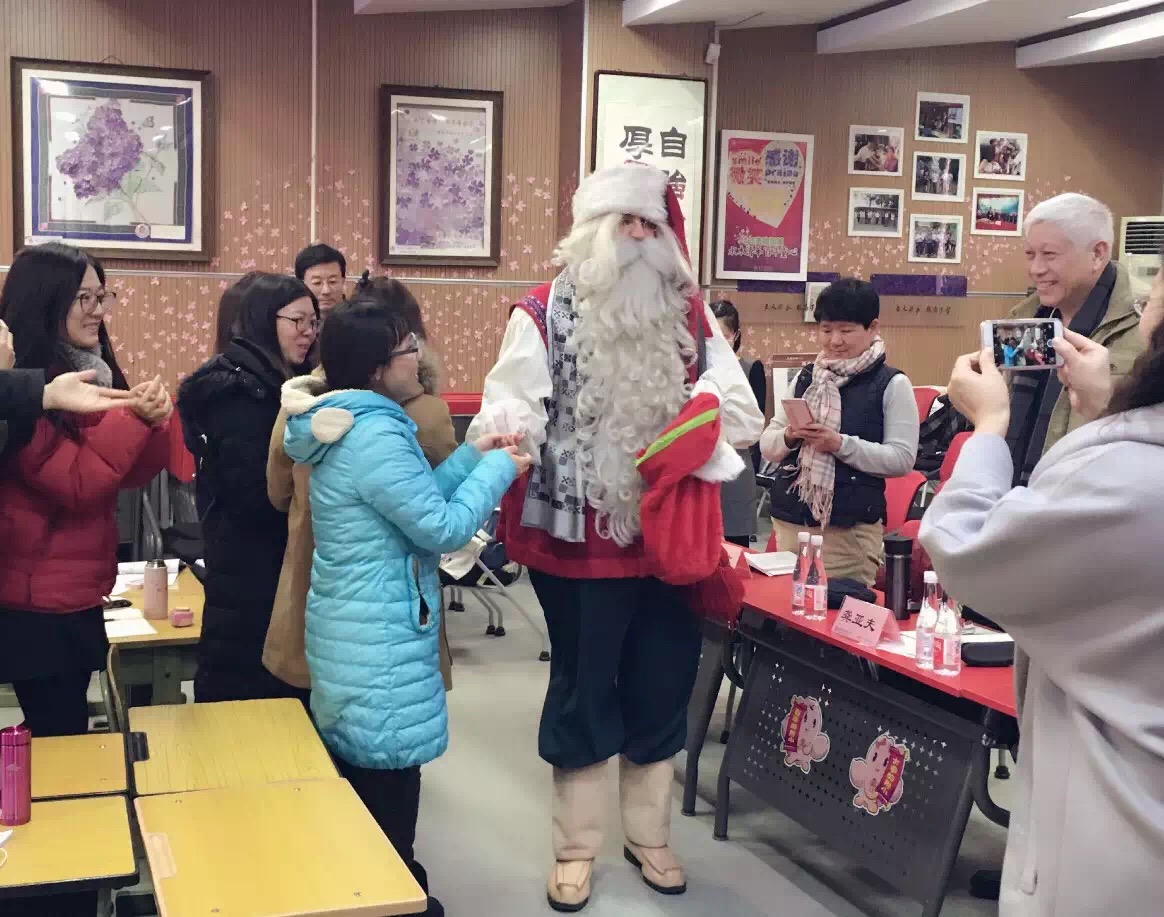 活动结束后,神秘的圣诞老人还走进不同年级不同班级,给同学们带来欢乐!您瞧,他和保洁叔叔阿姨一起来到了二年级8班;他还来到闻道厅,向来自海淀区兄弟院校的老师们送去了祝福!
