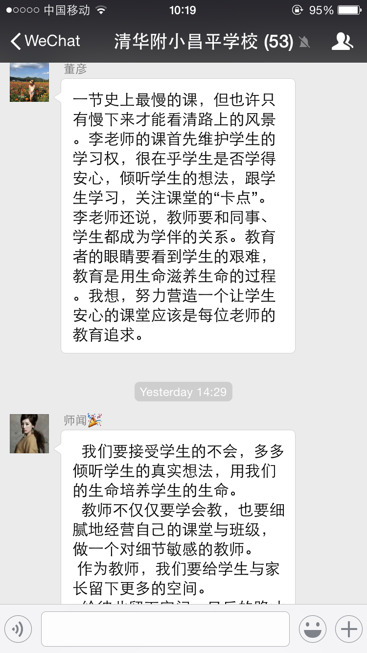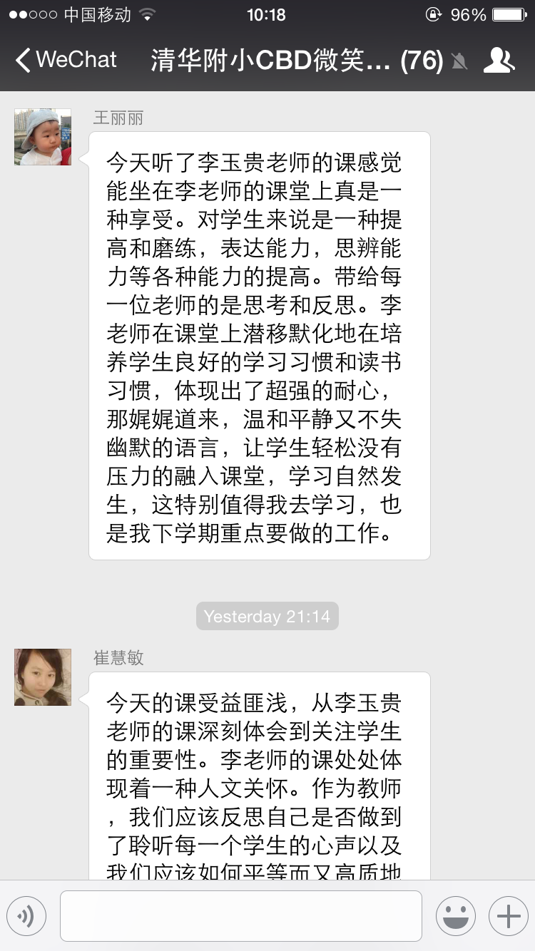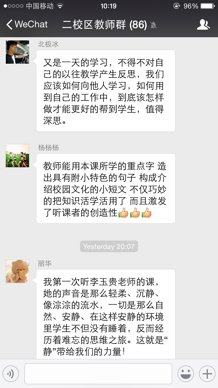 附小老师说:“今天听李老师讲‘没想好也可以安心说,越说越能想得更清楚’让自己受益很深。自己是一个不善于表达观点的人,因为觉得别人都特别聪明,观点都已经被表达地特别全面,我已经想无可想了,就不需要自己再多赘言。所以,一遇到发言就往后躲。现在明白了,哪怕与别人观点相同,用自己的语言讲出来也非常重要!”