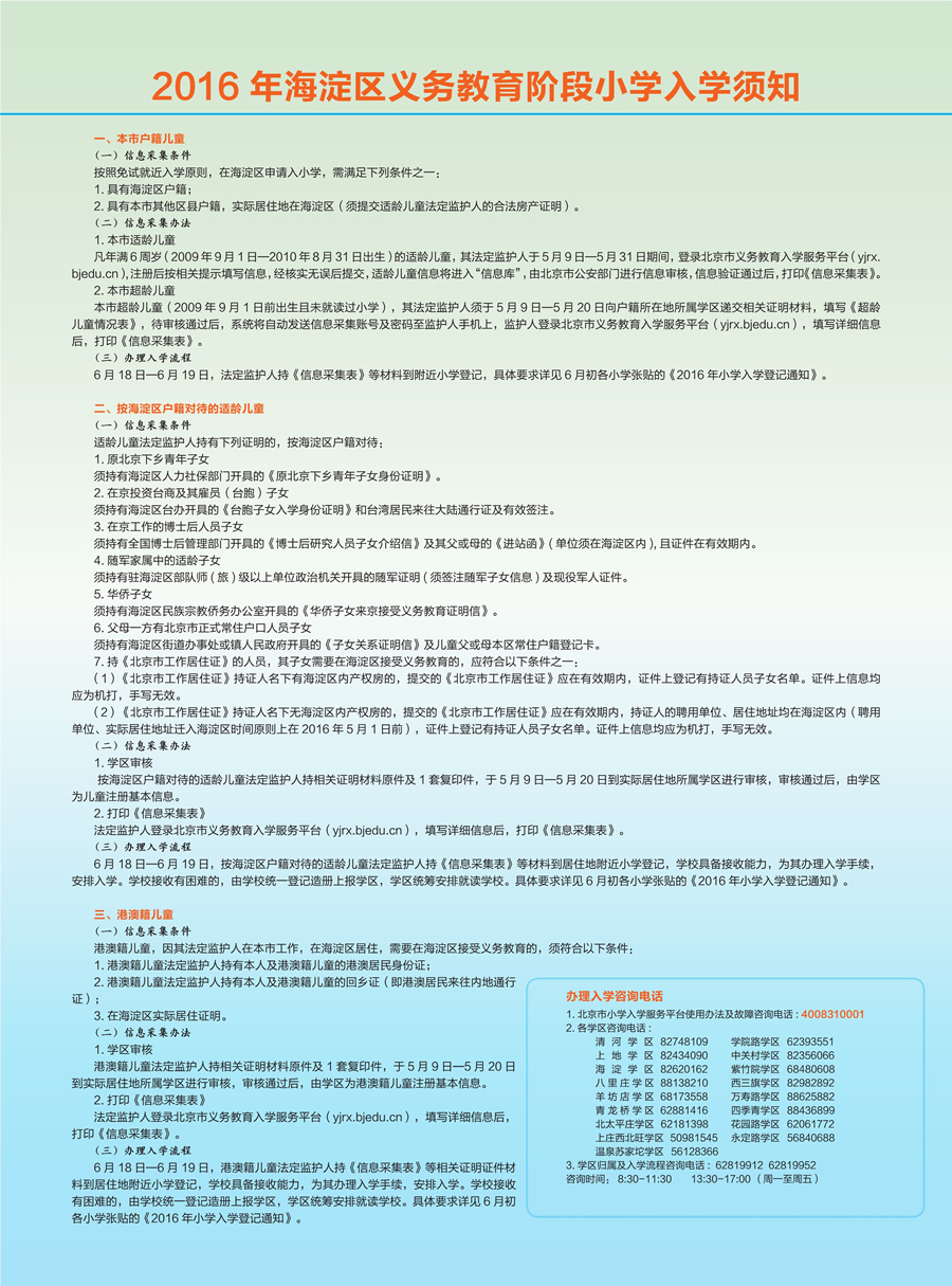 2016 年海淀区义务教育阶段小学入学须知