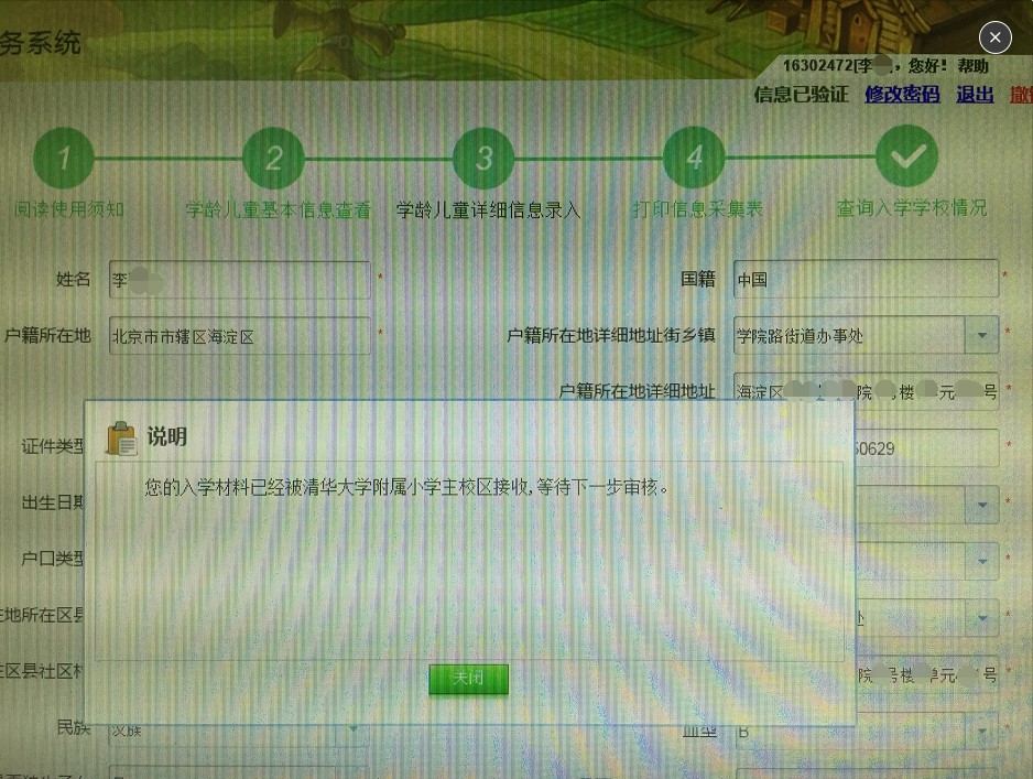 入校凭证:请家长登录义务教育入学服务平台http://yjrx.bjedu.cn/,点击最后一步”查询入学学校情况",将学校接收确认窗口(含学生姓名及右上角的家长姓名)用手机拍照。凭此入校。(提示:拍照时先把网页向上滚动一些,让孩子姓名避免出现在屏幕中心,然后点击“查询入学学校情况”按钮,这样弹出的对话框就不会挡住孩子姓名)。