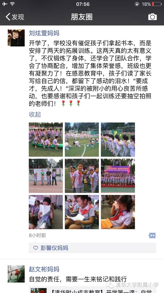 点击上方清华附小即可订阅哦!新学期,新百年,让儿童过一种新常态生活。每一个清华少年努力争做一名拥有自觉责任的成志少年。在奥运家国情怀的感召下,学生又在富有教育意义的体验中寻找自我成长的志趣。 快瞧啊,成志少年们在丰富多彩的拓展中展现了怎样的新样态? 01养成教育,构建儿童真实的道德生活社区 清华少年,知于未知与事理,行在实践与行动。养成教育,将学生完整发展的必备品格,浸润在六大主题的综合实践课程中,通过情感体验、动手实践、深度参与,构建儿童真实的道德生活社区。 新样态一:协商互让·闯八关我们相爱一生,一生还是太短。小伙伴一起心跳▲试一试吧,小伙伴每个人拉住一根绳子,他们的心与球一起在鼓上跳动。我们相爱一生,一生还是太短。毛毛虫四人行▲同样的节奏,同样的步伐,我们是奔驰在路上的毛毛虫!我们相爱一生,一生还是太短。十人夹球接力赛▲看我们多棒!十个小伙伴带球接力赛,可要小心不能让球落地哦!我们相爱一生,一生还是太短。新样态二:自律自强·战到底我们相爱一生,一生还是太短。摸石过河▲如何更快的“摸石过河”呢?我们的小窍门:可以让身体的重心低一点;可以让“石头”摆的距离近一点;还可以......你还有好办法吗?我们相爱一生,一生还是太短。滚铁环▲让铁环滚起来,好难啊!专注的练习后,瞧!我飞驰在跑道上,多帅!我们相爱一生,一生还是太短。沙包射击▲这是什么项目?看我使出洪荒之力,用力一掷! 我们相爱一生,一生还是太短。新样态三:尊重感恩·诉心声我们相爱一生,一生还是太短。 感恩心声▲一幅幅感人画面,激励我们心怀感恩,卓越攀行。 读出心声▲我们用心读着爸爸、妈妈写下的一字一句,眼眶不觉已渐渐湿润...... 赞出心声02积极心理,展现儿童站立世界的生命样态 在“100+1”的新常态养成教育中,学生过着积极有意义的生活。积极心理教育,让学生在自然的生态田园、温润的儿童乐园、开放的人文家园里,找到健康、阳光、乐学的一种生命样态。我们相爱一生,一生还是太短。新样态四:积极心理·微微笑我们相爱一生,一生还是太短。头脑特工队 ▲认识我的情绪,遇事积极面对。 微笑我传递 03自觉责任,打下儿童终身发展的生命底色 2016年9月5日-7日奔赴密云素质拓展基地,开展了为期三天的成志修远素养拓展营活动,这是高年段修远课程的起始点。 新样态五:自觉责任·启修远 用理想与抱负描绘▲开营仪式,开始意识到自己肩负着哪些责任……我们相爱一生,一生还是太短。用意志与品质诠释▲满满的正能量,你get了没有?▲虽然受了点伤,但我也会努力坚强!我们相爱一生,一生还是太短。用实践与行动履行▲训练有素,言行得体▲为你服务,我的荣耀▲勇于担当,助人为乐▲尊重感恩,奖状里洒满汗水。学生感 言 这一次成志修远素养拓展营,正是一个检验我们自己的时刻。在活动中,我们要勇于担当,自觉主动地承担自己的责任,自律自强,充实圆满地完成这次成志修远素养拓展任务,努力成为有自觉责任的成志少年! Nothing is difficult if your heart into it.nothing is easy if you don’t try your best .If you don’t try your best no matter succeed or not ,you can learn to become confident 成志教育 照耀一生 微信号