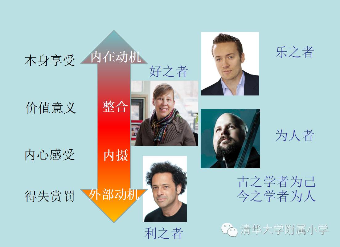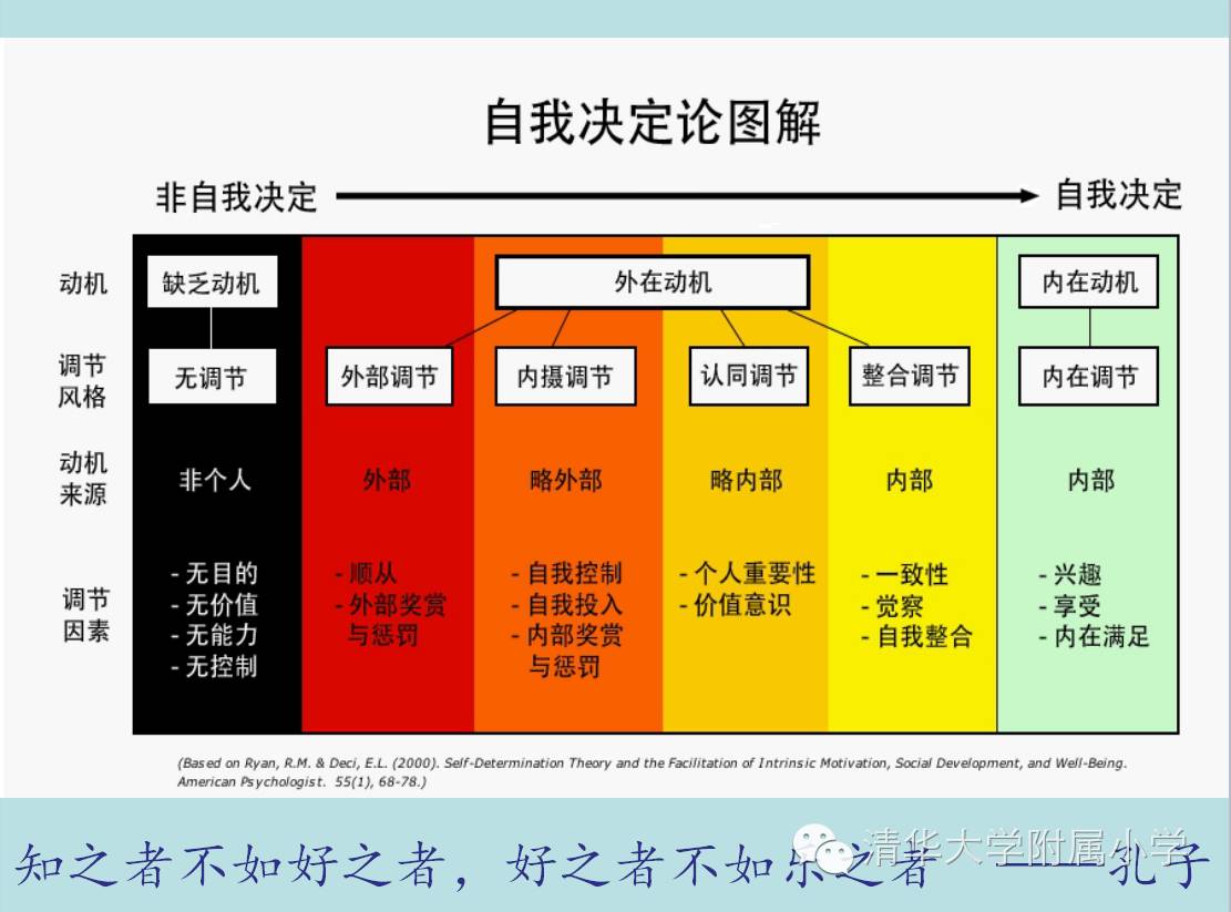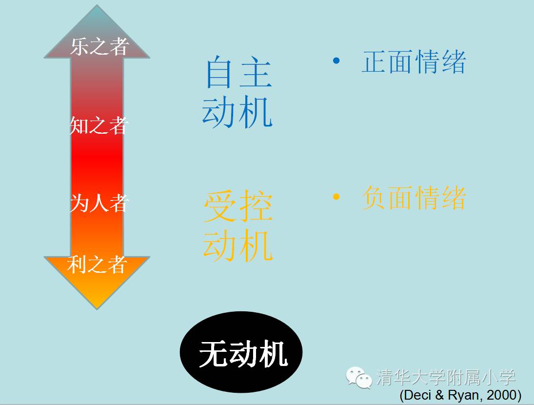 一个人总是由自主动机决定自己做什么,就有了自我。人生本身没有固定的目标,如果能让孩子有自主动机,无论做成什么都不会有遗憾!自主动机强的人,正面情绪波动大,更愿意投入,适合创造性工作,正面应对高,受控动机小;负面情绪波动大,表现为疏离,在重复性工作表现较好!所以,大家从引导孩子自主动机的方向上去思考!