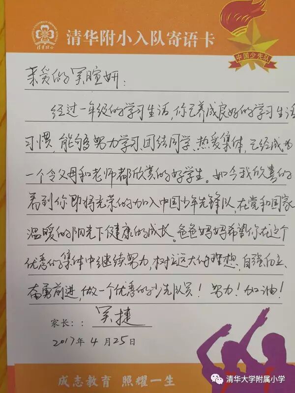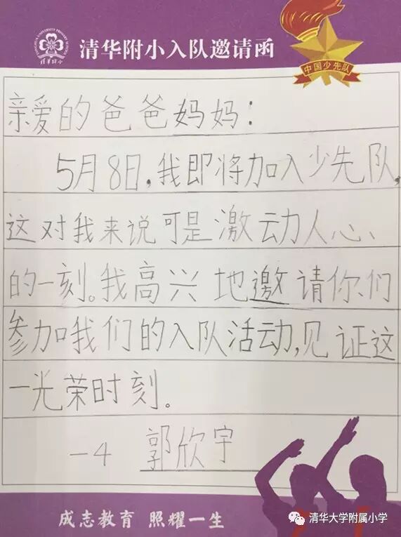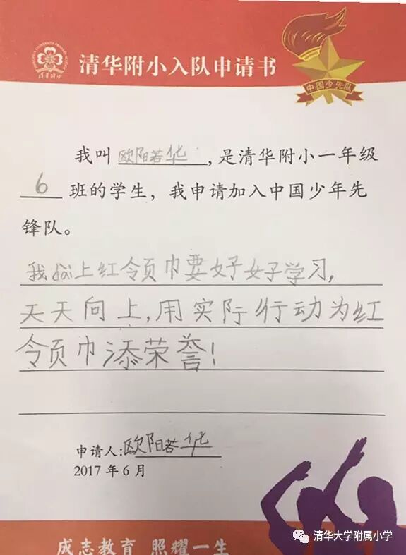 从进入清华附小的第一天起,我就特别羡慕哥哥姐姐胸前飘扬的红领巾。听老师说,做一名合格的少先队员,就要在养成教育中做到言行得体,做到健康、阳光、乐学,做到拥有中国灵魂、国际视野,做到有“家国情怀、完整人格”追求,养成关键能力和必备品格。